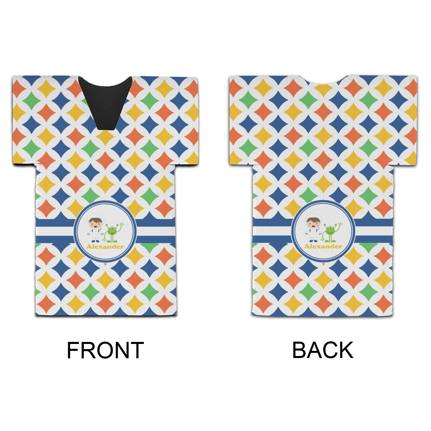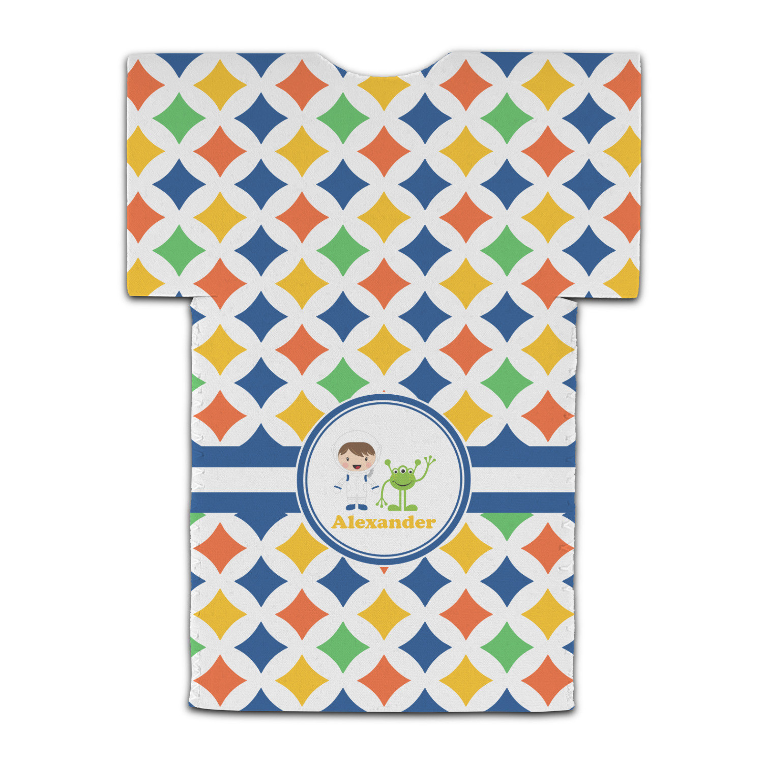 A white wide band trimmed in coordinating blue breaks up the pattern and showcases your little space guy with his martian buddy. Add personalization of your choice for that special touch.