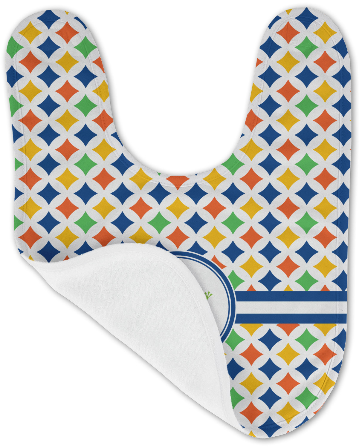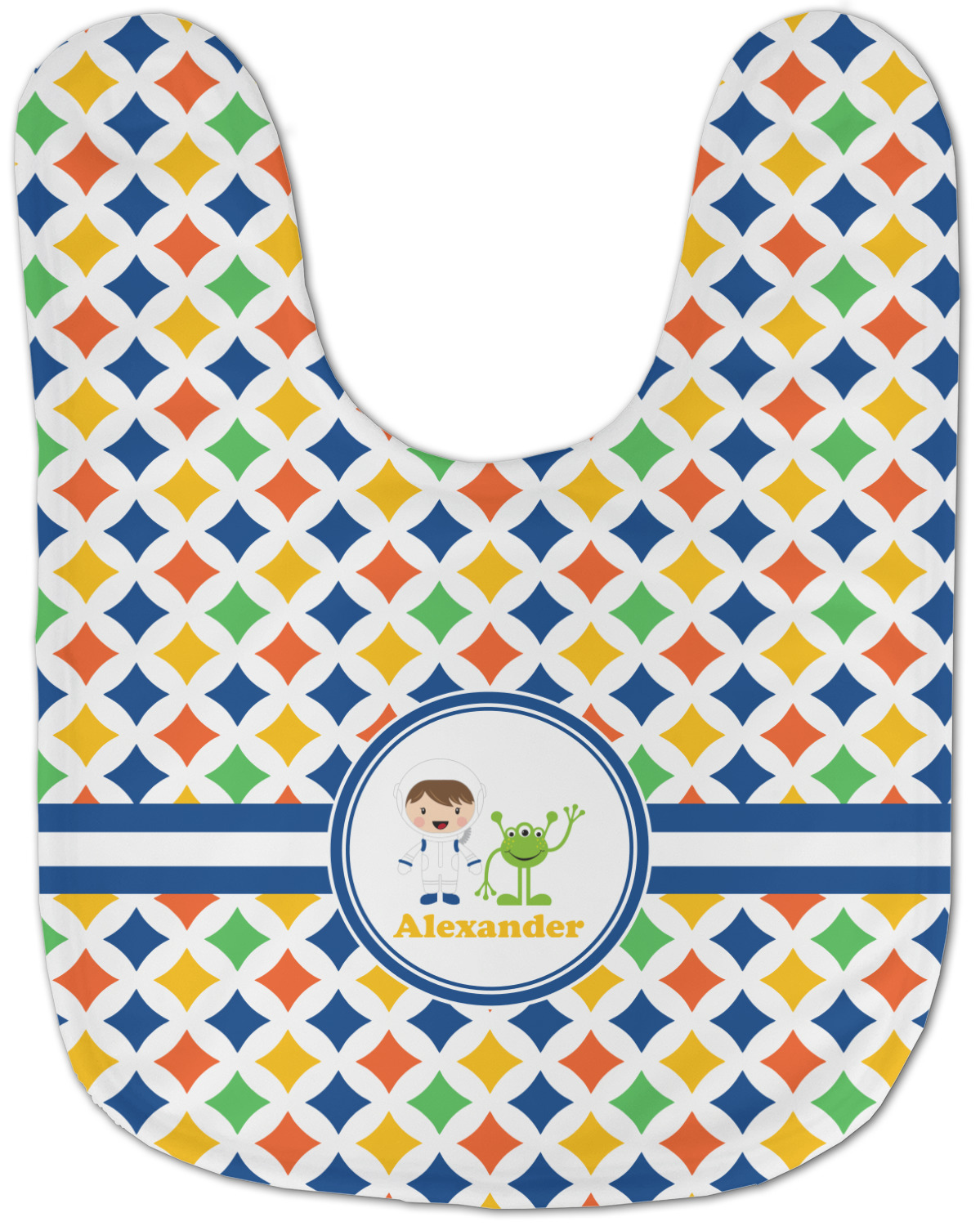 Made of soft polyester, each customizable bib hugs comfortably around the neck to catch every drip and drool. Each bib design is printed with baby-safe ink and finished with a secure stitch pattern and velcro clasp. We carry two customizable bib styles -Microfiber Velour and Jersey Knit.