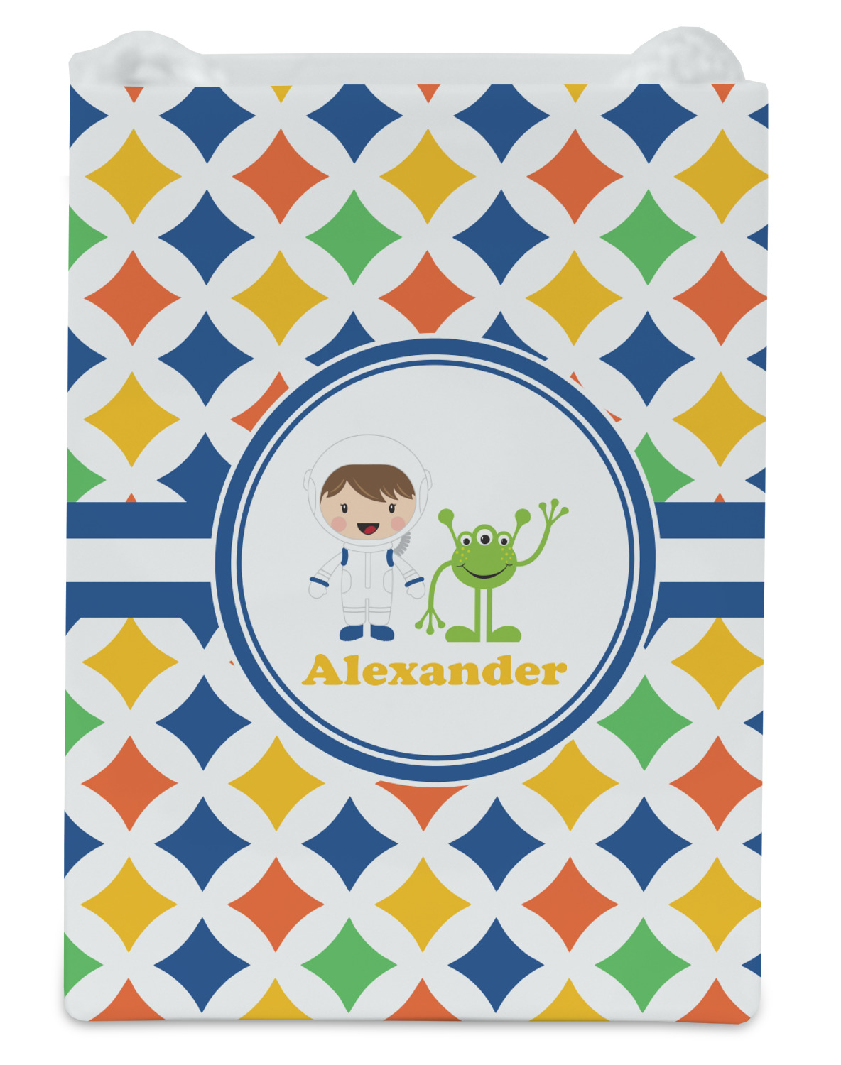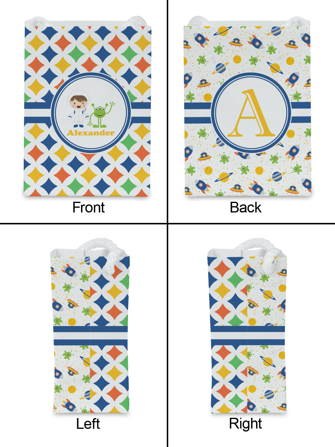 A white wide band trimmed in coordinating blue breaks up the pattern and showcases your little space guy with his martian buddy. Add personalization of your choice for that special touch.
