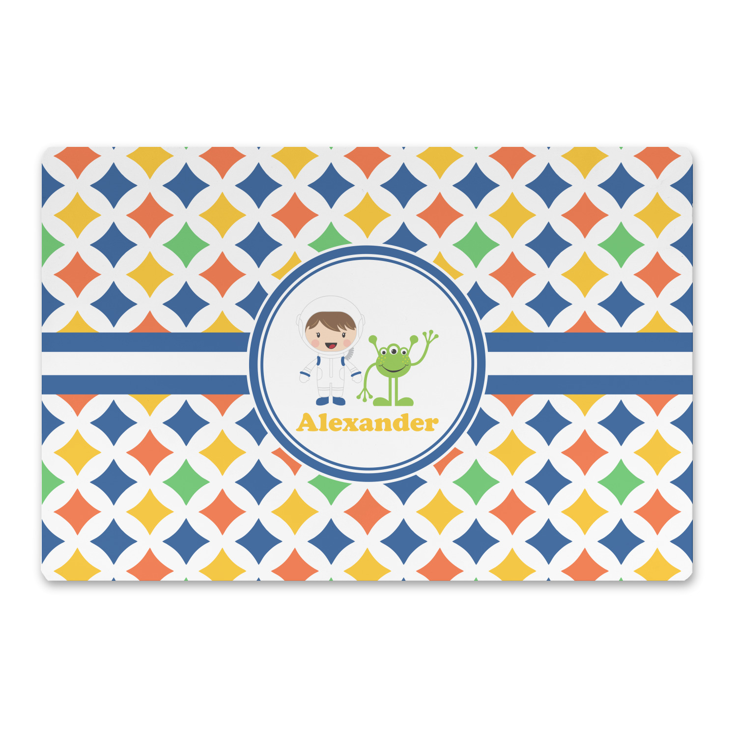 A white wide band trimmed in coordinating blue breaks up the pattern and showcases your little space guy with his martian buddy. Add personalization of your choice for that special touch.