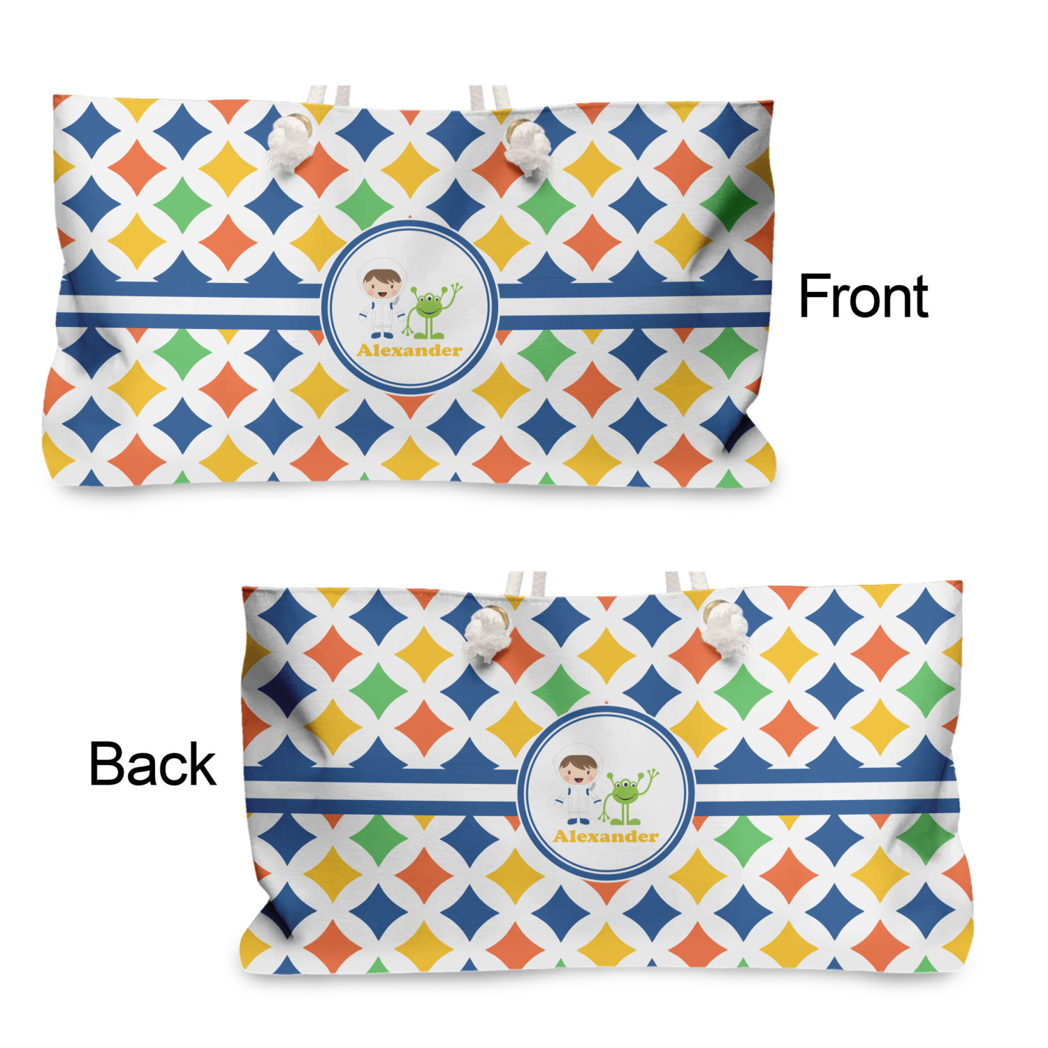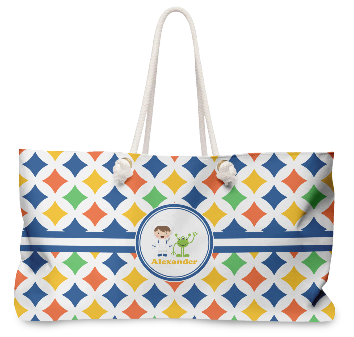 A white wide band trimmed in coordinating blue breaks up the pattern and showcases your little space guy with his martian buddy. Add personalization of your choice for that special touch.