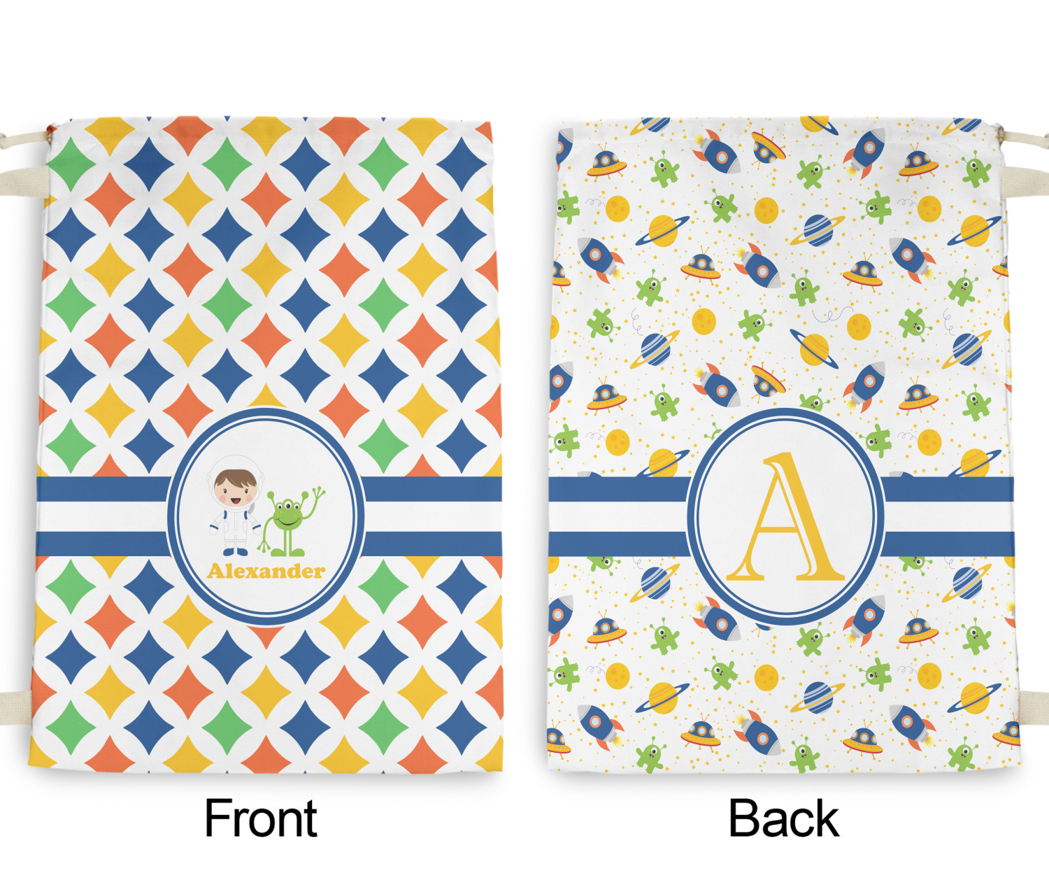 A white wide band trimmed in coordinating blue breaks up the pattern and showcases your little space guy with his martian buddy. Add personalization of your choice for that special touch.