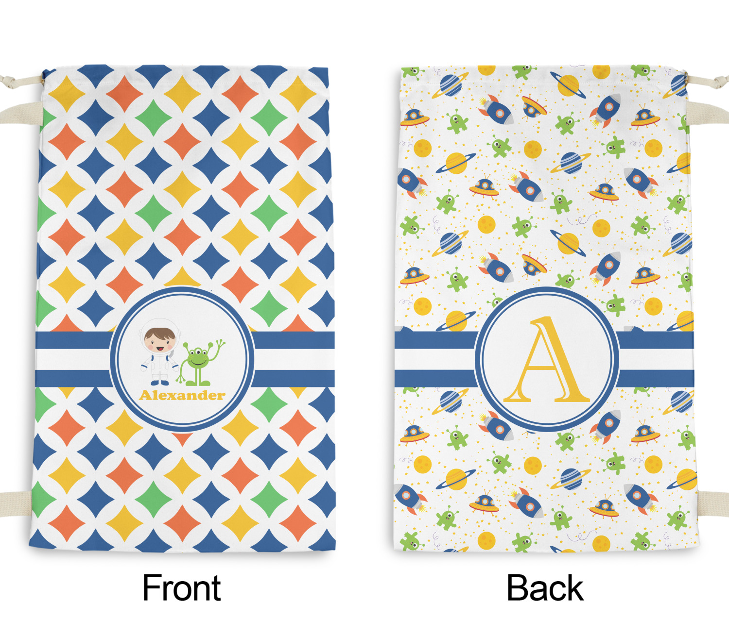 A white wide band trimmed in coordinating blue breaks up the pattern and showcases your little space guy with his martian buddy. Add personalization of your choice for that special touch.