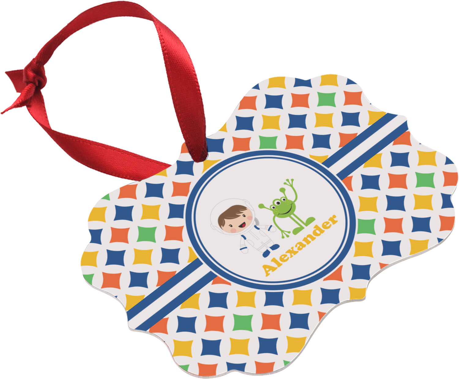 A white wide band trimmed in coordinating blue breaks up the pattern and showcases your little space guy with his martian buddy. Add personalization of your choice for that special touch.