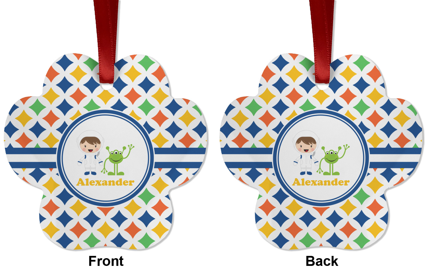 A white wide band trimmed in coordinating blue breaks up the pattern and showcases your little space guy with his martian buddy. Add personalization of your choice for that special touch.