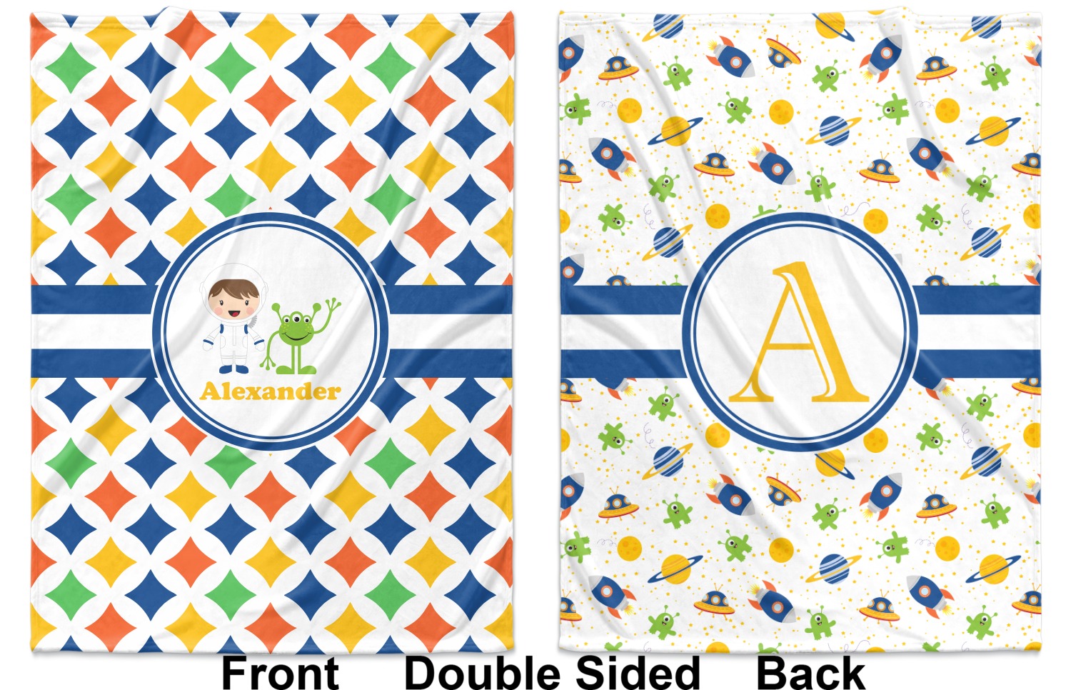 A white wide band trimmed in coordinating blue breaks up the pattern and showcases your little space guy with his martian buddy. Add personalization of your choice for that special touch.