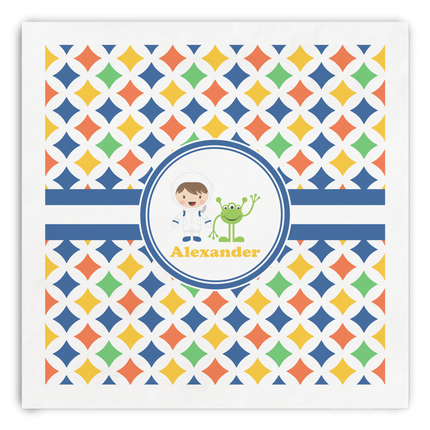 A white wide band trimmed in coordinating blue breaks up the pattern and showcases your little space guy with his martian buddy. Add personalization of your choice for that special touch.