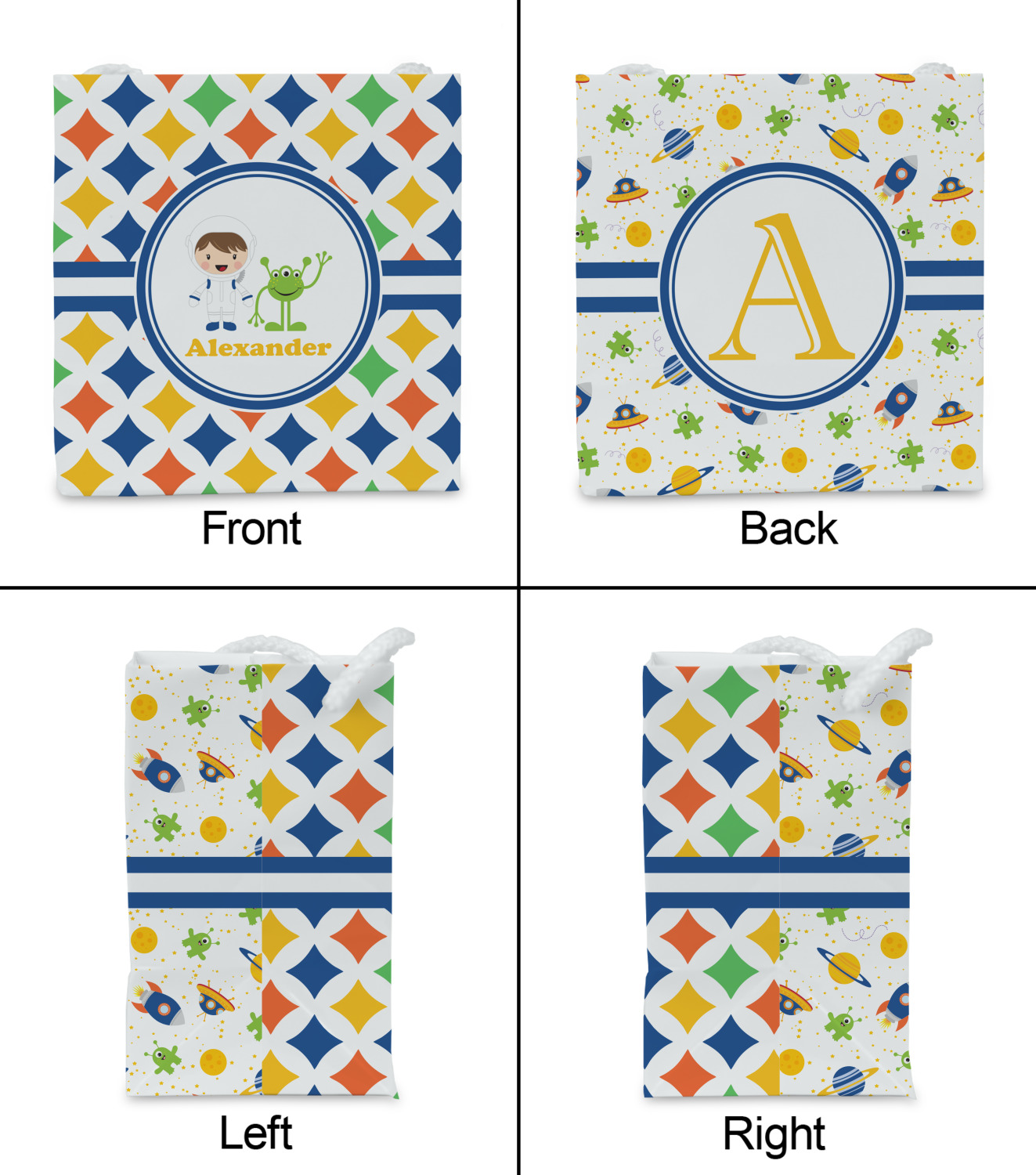 A white wide band trimmed in coordinating blue breaks up the pattern and showcases your little space guy with his martian buddy. Add personalization of your choice for that special touch.