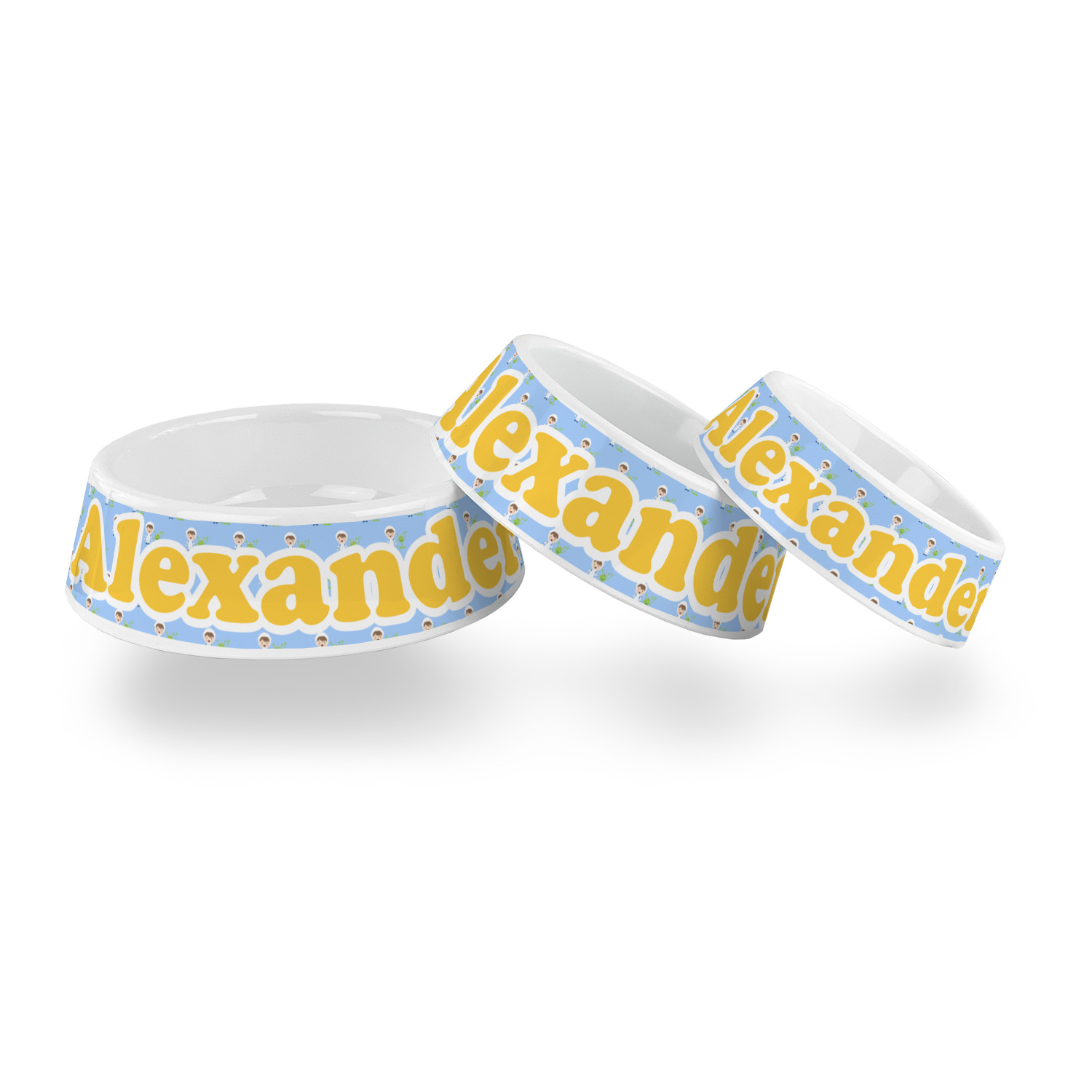 A white wide band trimmed in coordinating blue breaks up the pattern and showcases your little space guy with his martian buddy. Add personalization of your choice for that special touch.