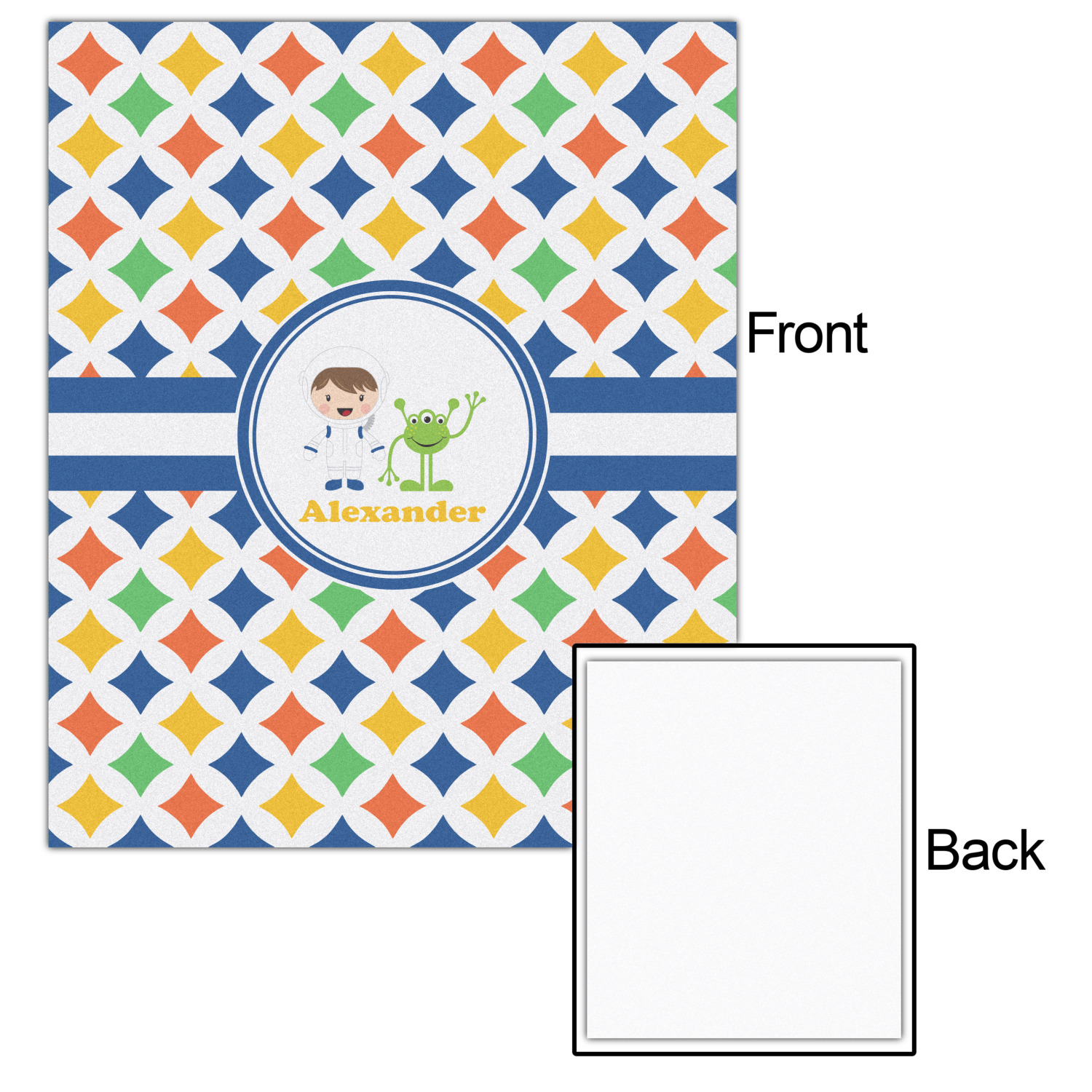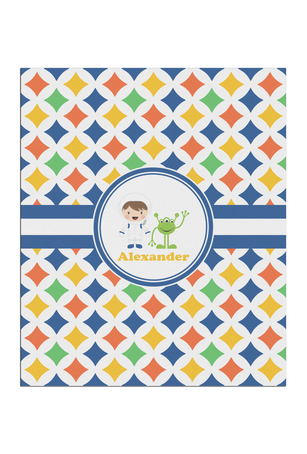 A white wide band trimmed in coordinating blue breaks up the pattern and showcases your little space guy with his martian buddy. Add personalization of your choice for that special touch.