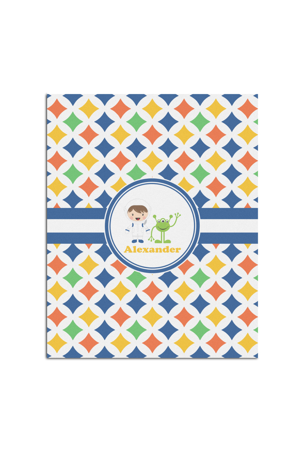A white wide band trimmed in coordinating blue breaks up the pattern and showcases your little space guy with his martian buddy. Add personalization of your choice for that special touch.