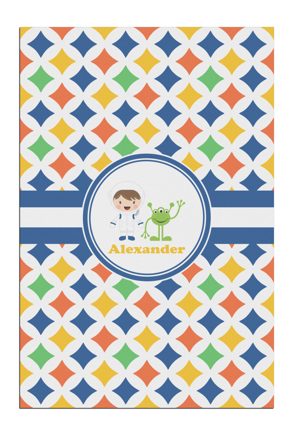 A white wide band trimmed in coordinating blue breaks up the pattern and showcases your little space guy with his martian buddy. Add personalization of your choice for that special touch.
