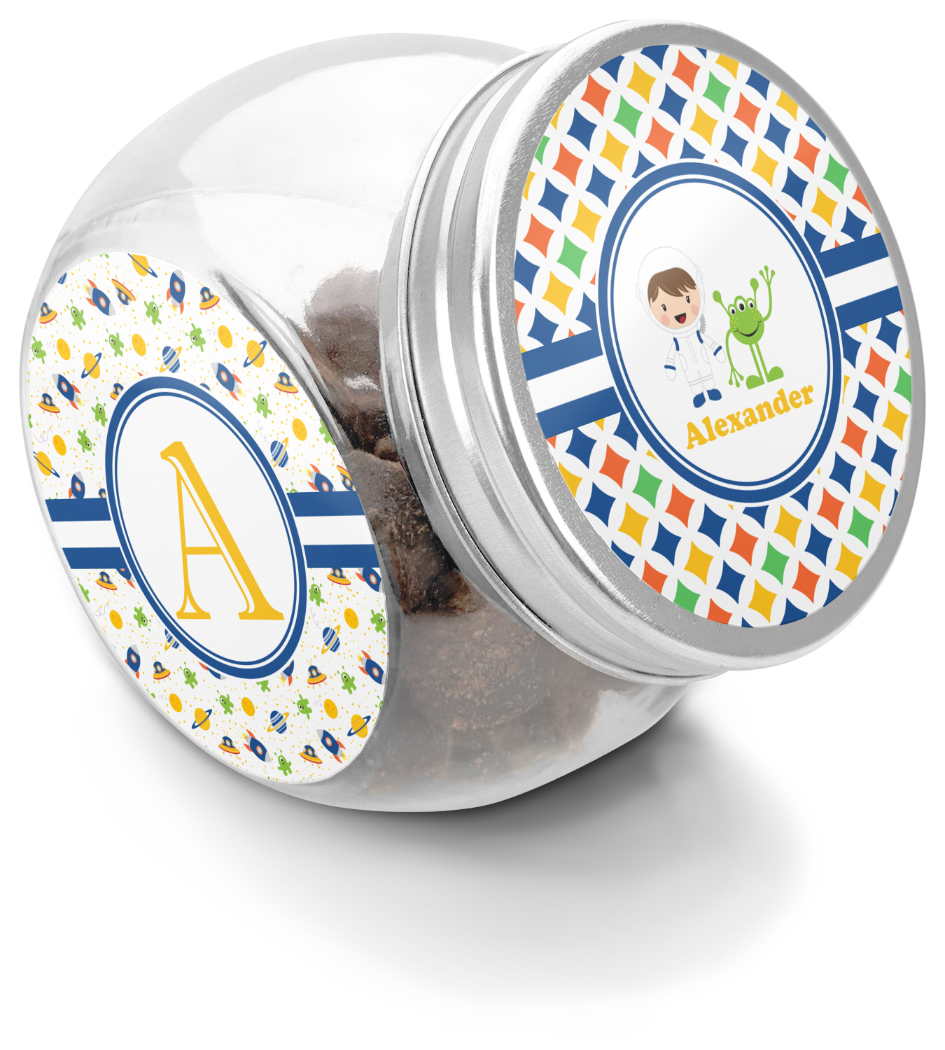This treat jar is an excellent way to store treats for your favorite canine or feline. Moreover, their delicate, classy appearance makes them a tasteful addition to your countertop's décor. Crafted from clear glass, its unique construction and silver metal, screw-on lid allows for quick and easy access. Three, permanent, vinyl stickers are applied to both sides of the jar and lid, presenting your personalized design. The base of this glass, dog treat jar is 3.4" x 4.75", and the jar stands at 5" tall. Though on the smaller side, this jar is best suited for smaller treats or training treats.