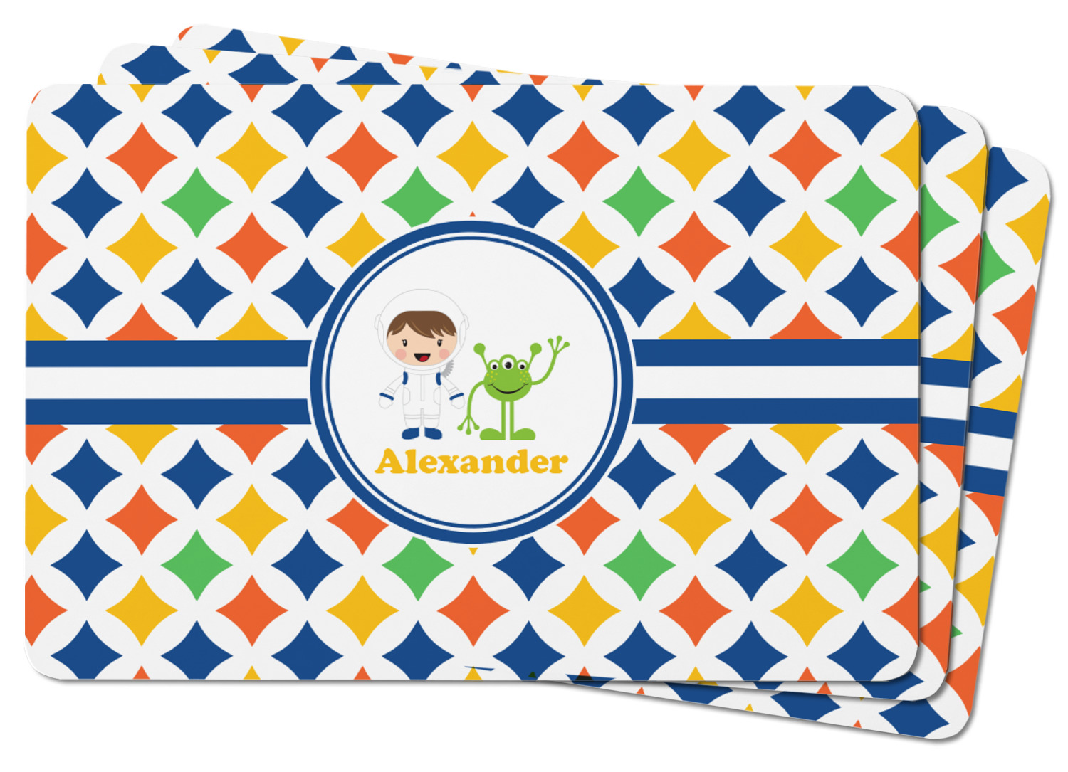 A white wide band trimmed in coordinating blue breaks up the pattern and showcases your little space guy with his martian buddy. Add personalization of your choice for that special touch.