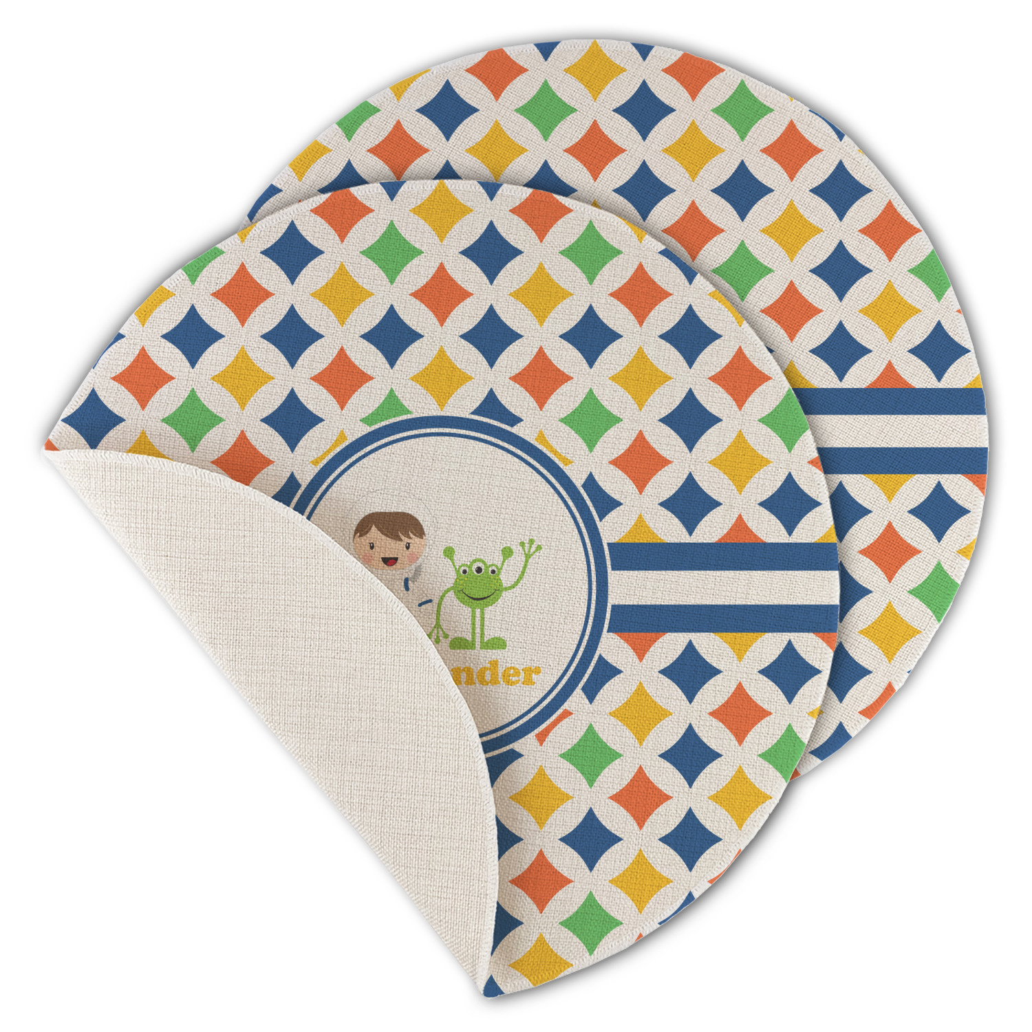 A white wide band trimmed in coordinating blue breaks up the pattern and showcases your little space guy with his martian buddy. Add personalization of your choice for that special touch.