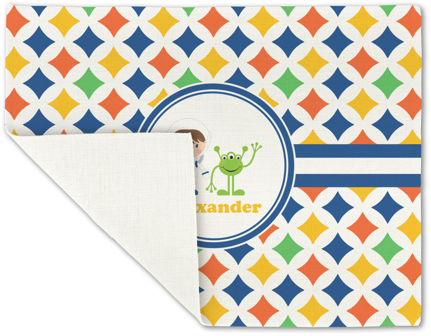 A white wide band trimmed in coordinating blue breaks up the pattern and showcases your little space guy with his martian buddy. Add personalization of your choice for that special touch.