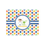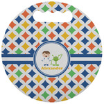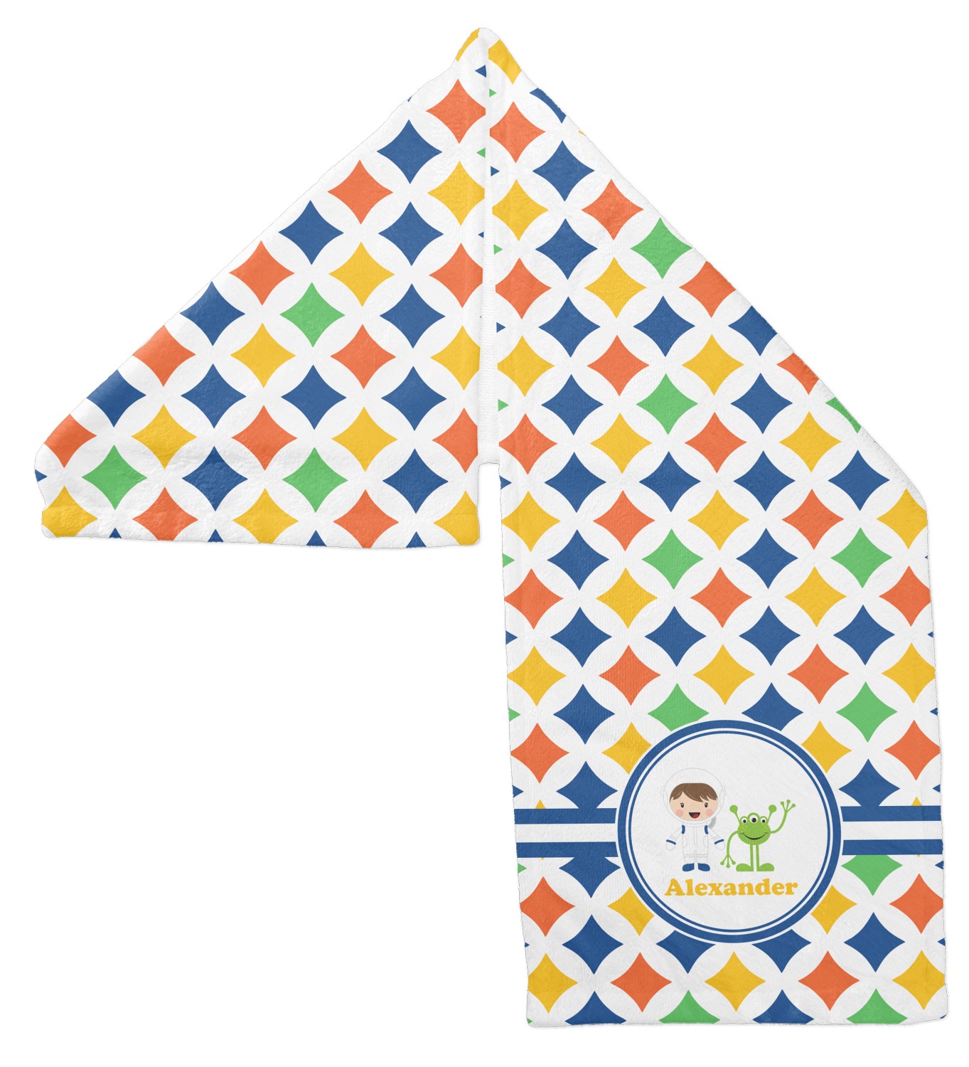 A white wide band trimmed in coordinating blue breaks up the pattern and showcases your little space guy with his martian buddy. Add personalization of your choice for that special touch.