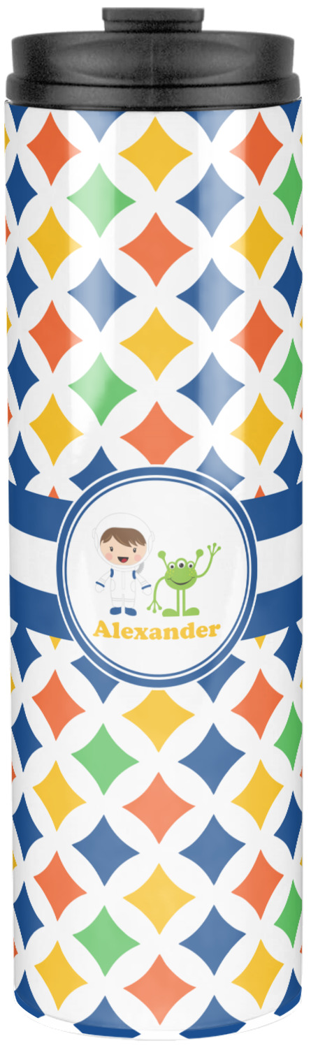 A white wide band trimmed in coordinating blue breaks up the pattern and showcases your little space guy with his martian buddy. Add personalization of your choice for that special touch.