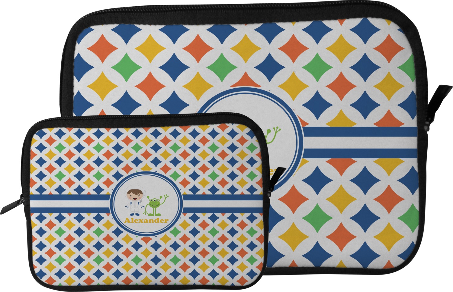 These tablet covers are fabricated from a water-resistant neoprene, and feature a zipper at its top for easy access to your device. The supple, cushioned nature of the neoprene will protect your tablet from the mishaps of daily life. Your personalized design is printed on the front of the I-Pad case, while the remaining sides are black in color. We provide this case in two sizes, in order to best accommodate your device. Our smaller size can fit a tablet with an 11 inch screen, while our larger sleeve is better suited for devices with approximately a 13 inch screen.