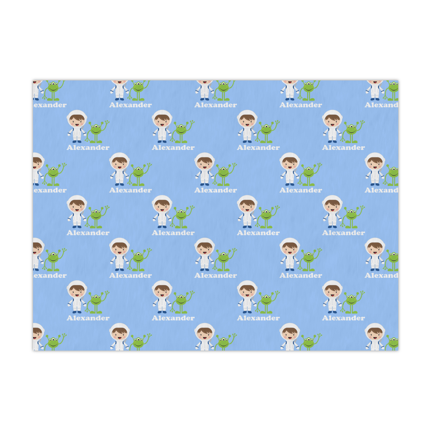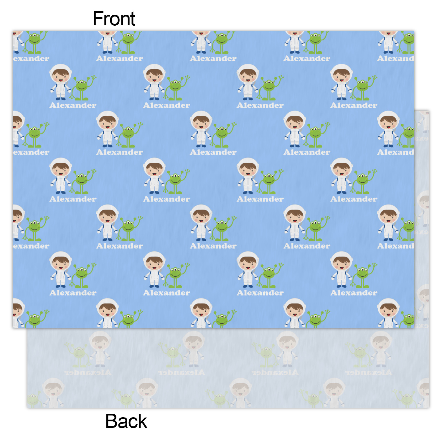 A white wide band trimmed in coordinating blue breaks up the pattern and showcases your little space guy with his martian buddy. Add personalization of your choice for that special touch.