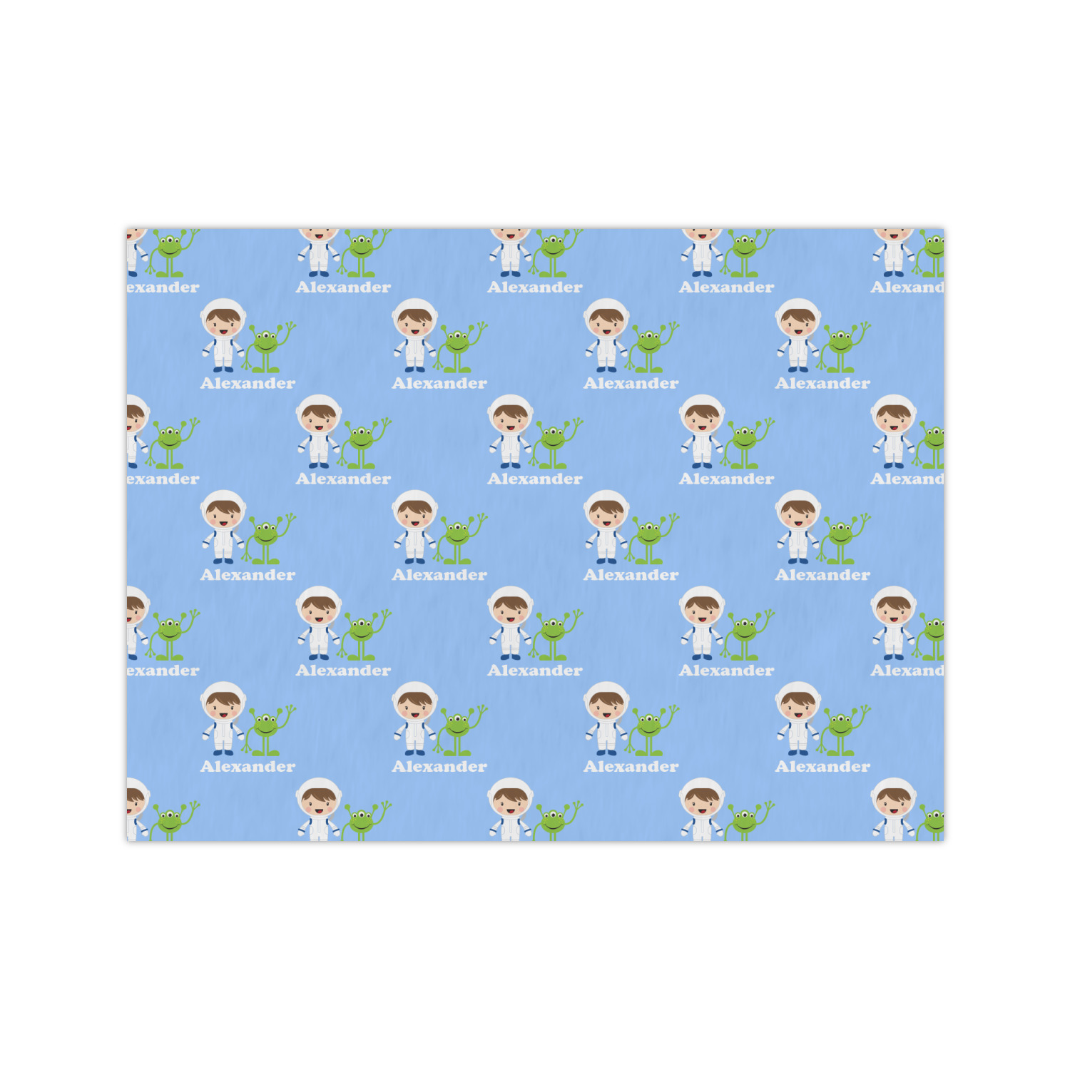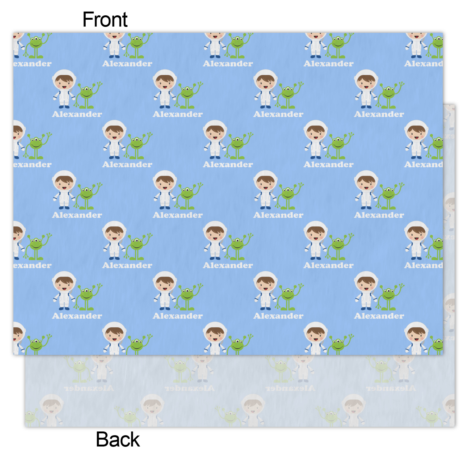 A white wide band trimmed in coordinating blue breaks up the pattern and showcases your little space guy with his martian buddy. Add personalization of your choice for that special touch.