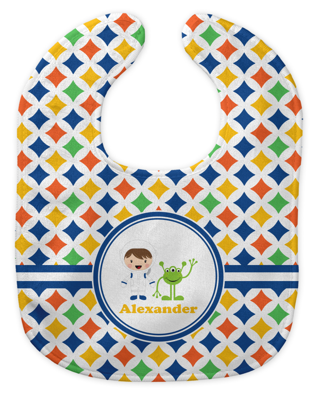 A white wide band trimmed in coordinating blue breaks up the pattern and showcases your little space guy with his martian buddy. Add personalization of your choice for that special touch.