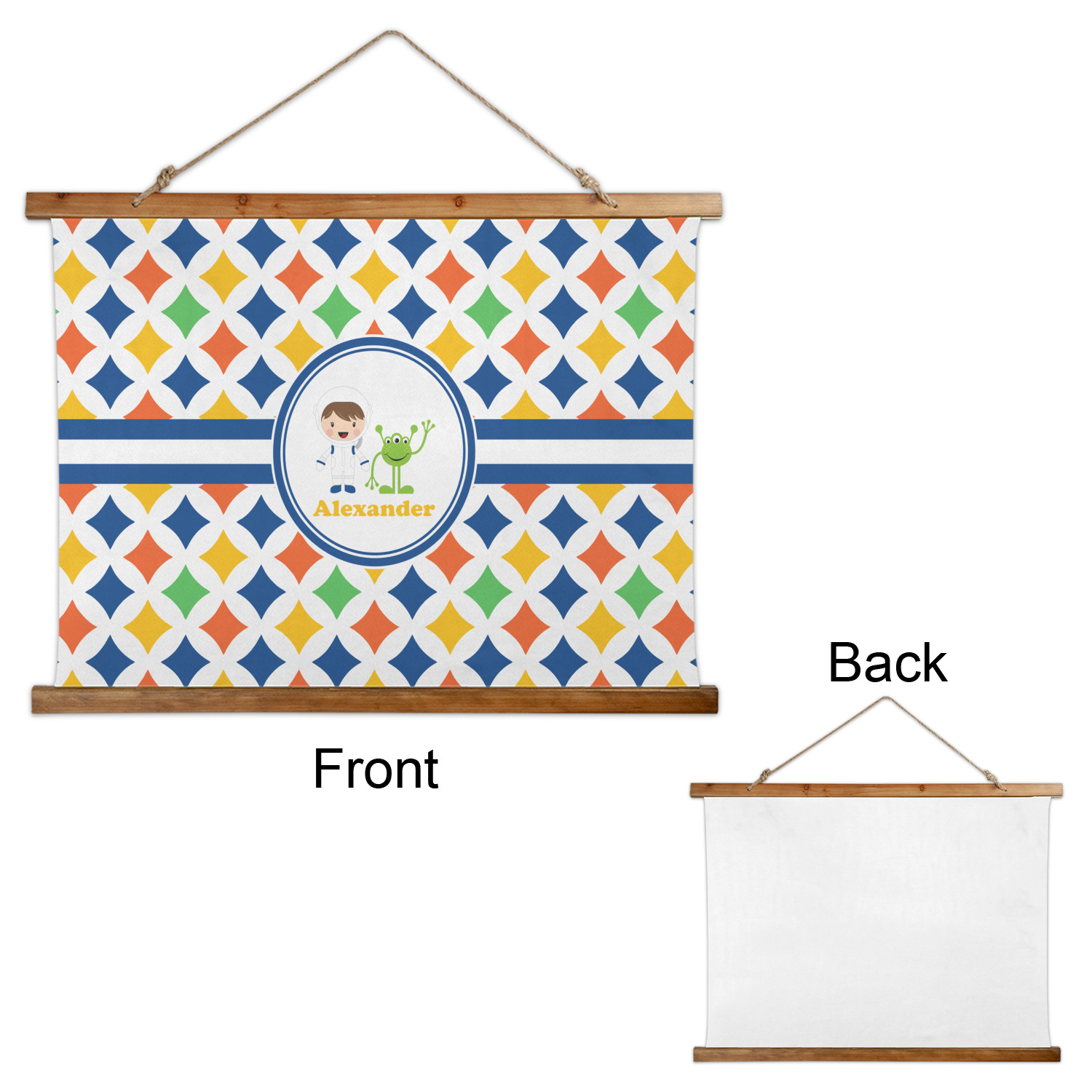 Made in two different orientations - portrait or landscape - both are 26" x 36". Your design is printed on a high quality polyester fabric with hemmed edges. The wood on the top and bottom of the tapestry is 1.25" tall and 0.25" thick and there are two pieces on top and bottom which sandwich the fabric.