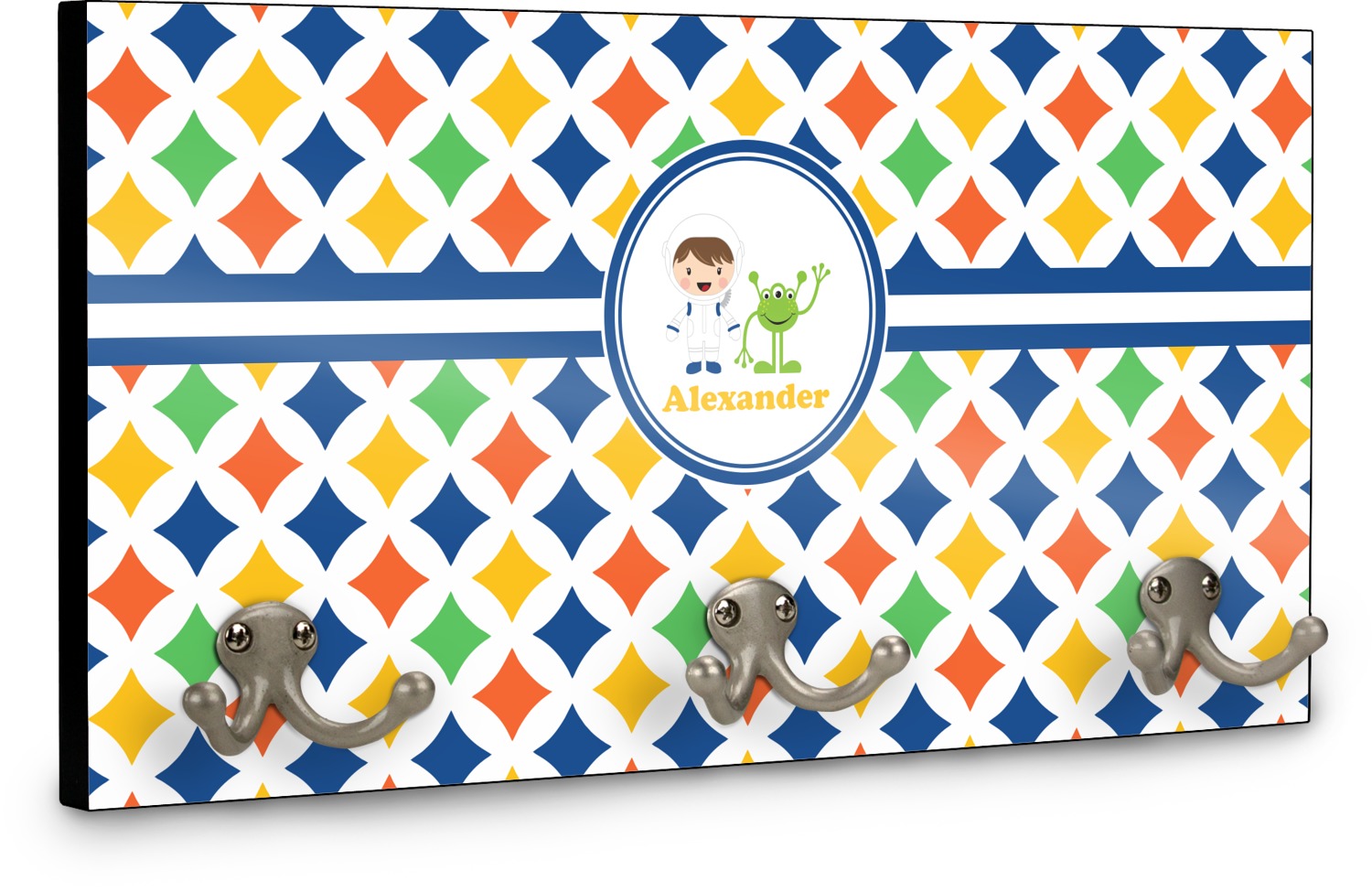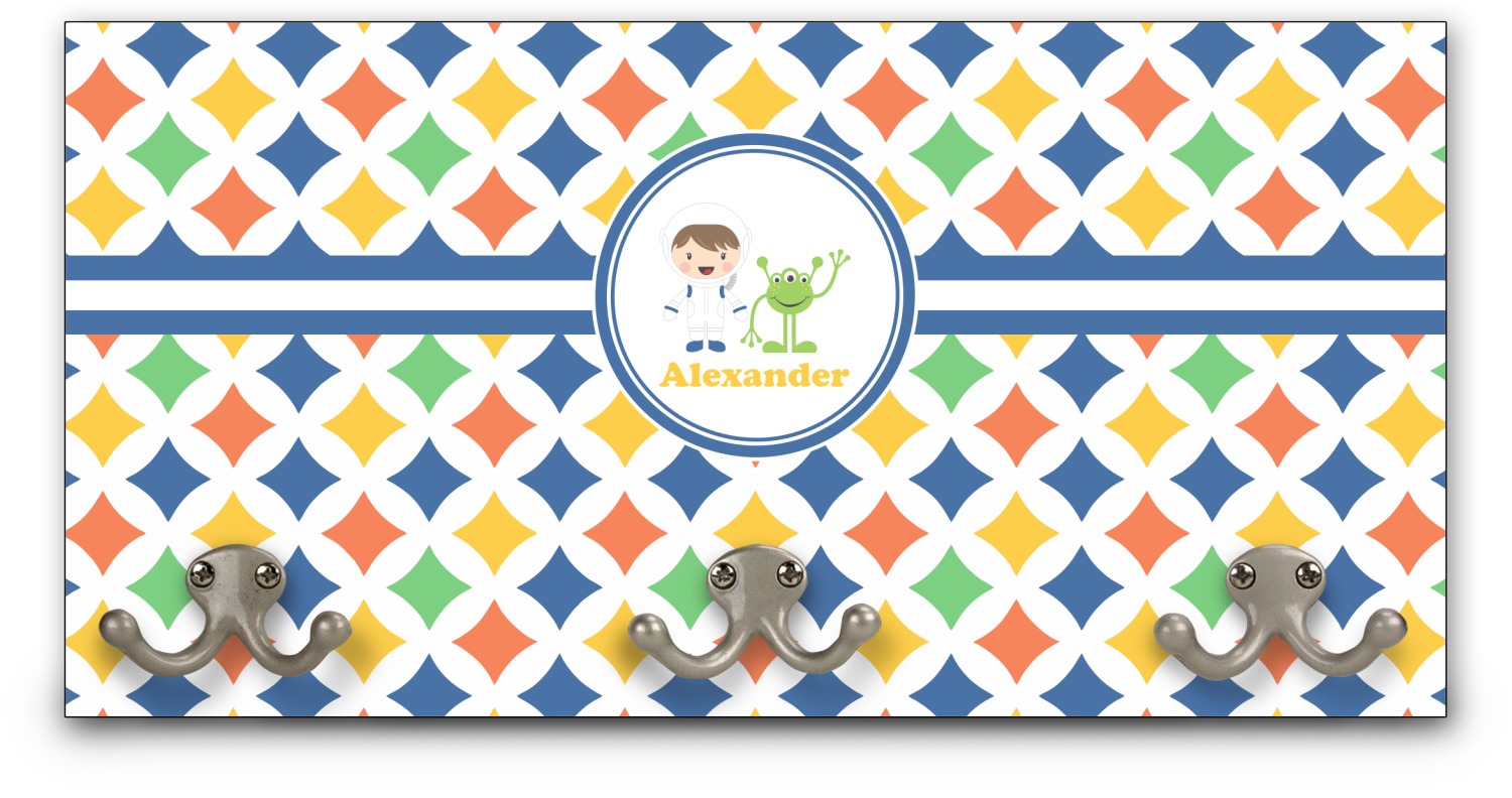 This coat rack is the perfect way to add some personality to your wall or entryway. The board is made of a strong maple that is approximately 16" x 8". The three 2-prong hooks are a sturdy metal that have three screws attaching them to the board. Your design is printed right onto the front of the board while the back and sides are a simple black.
