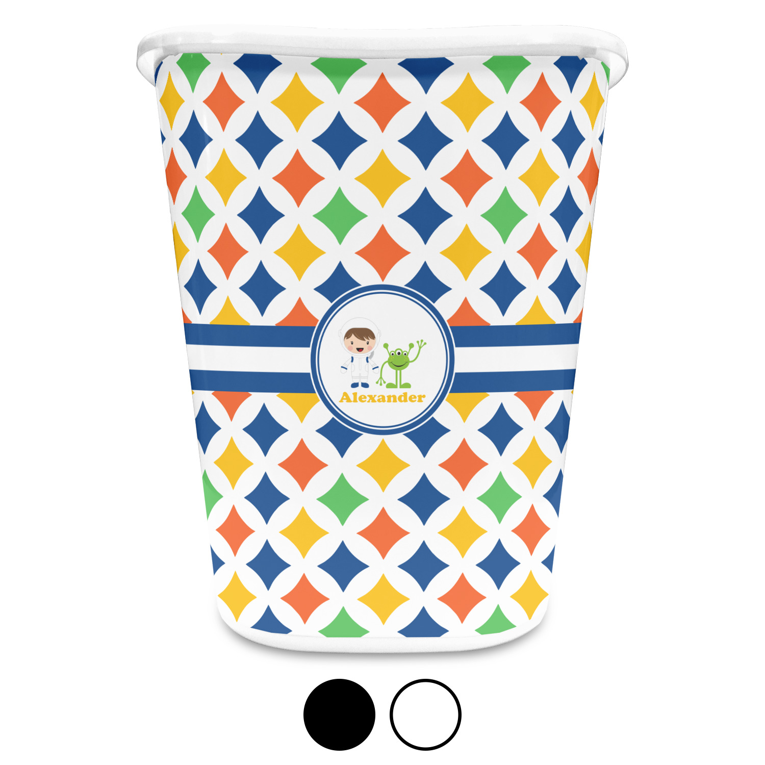 You can choose to purchase these decorative wastebaskets in either a white or a black color that will show on the base and the upper rim. Your customization is printed on a high-gloss, fine-quality vinyl adhesive, and you can choose to either have this adhesive applied to one side only or to both sides. As such, this plastic wastebasket can be single-sided or double-sided, depending on your creative vision. Your customization is printed using durable inks, making the design waterproof and resistant to fading over time.
