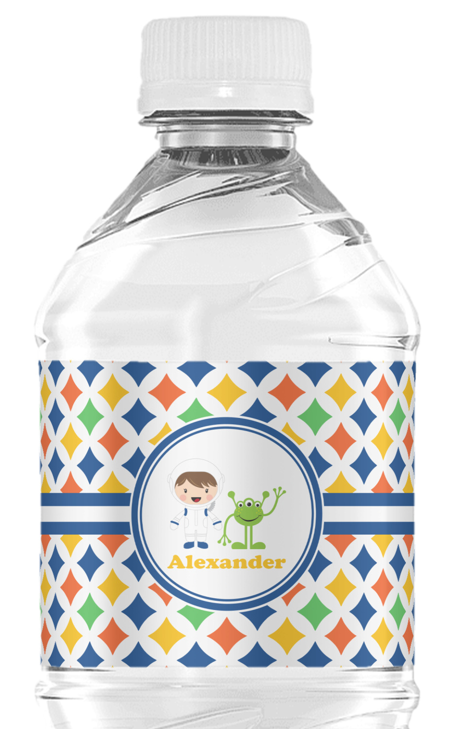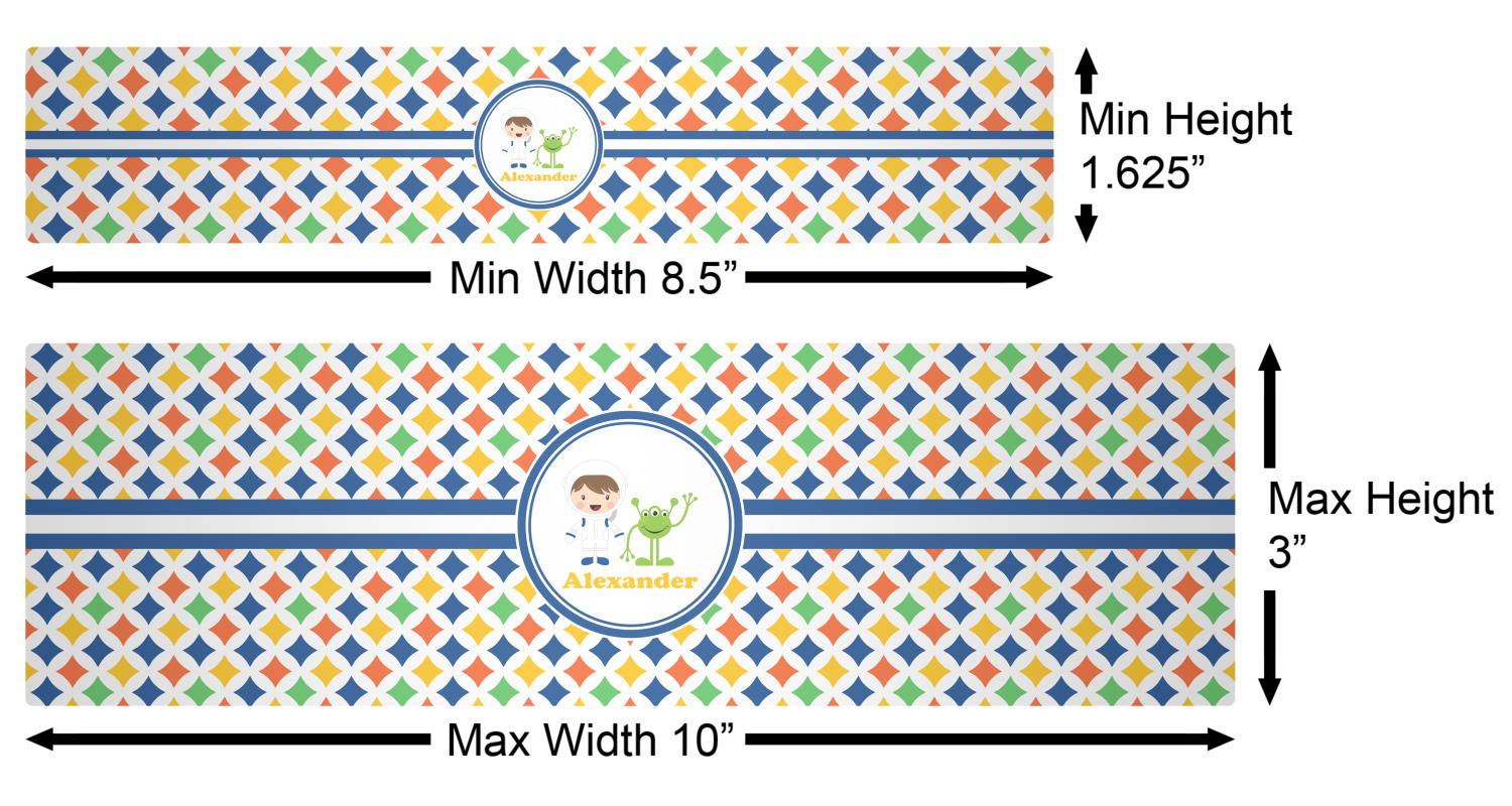 A white wide band trimmed in coordinating blue breaks up the pattern and showcases your little space guy with his martian buddy. Add personalization of your choice for that special touch.