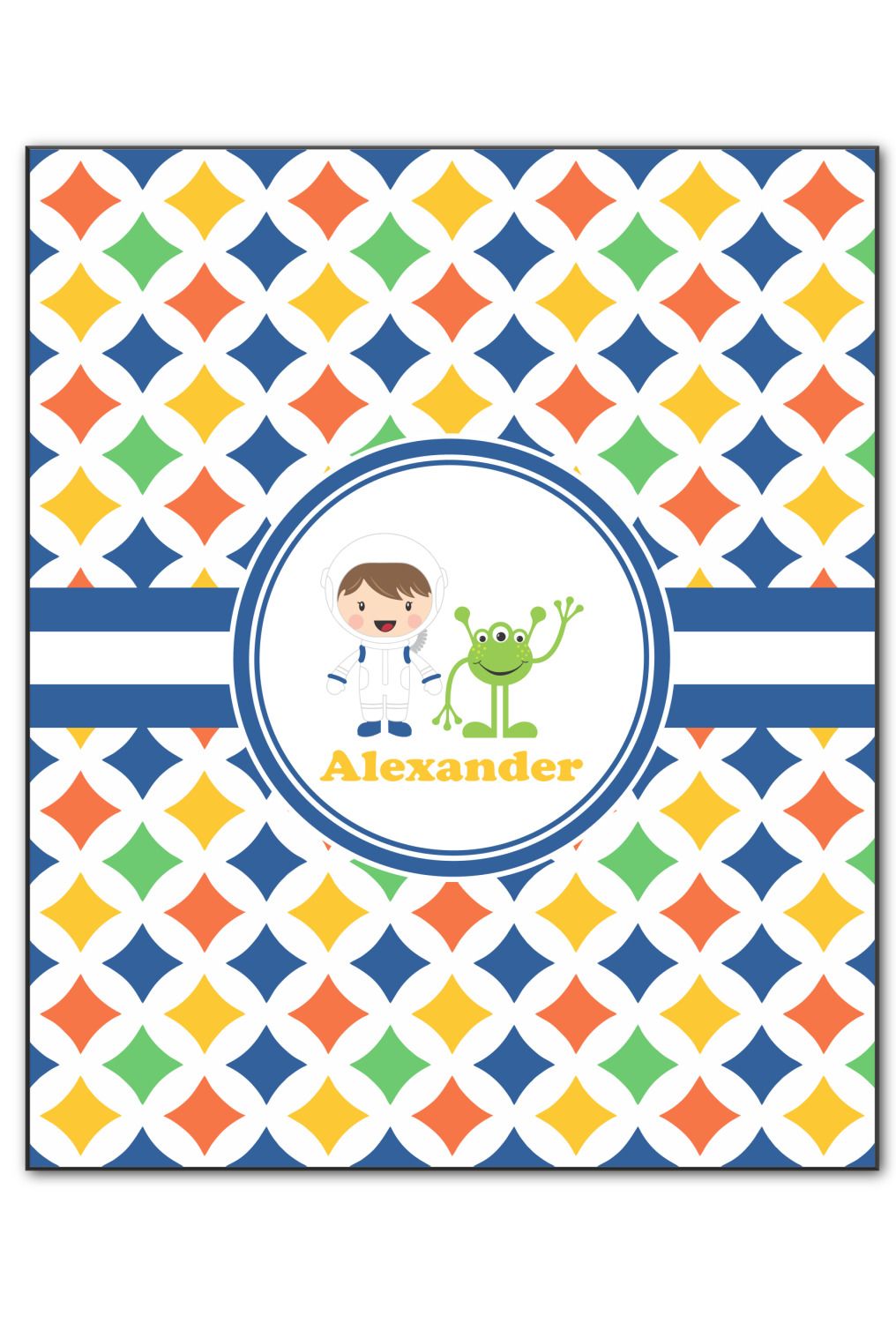 A white wide band trimmed in coordinating blue breaks up the pattern and showcases your little space guy with his martian buddy. Add personalization of your choice for that special touch.