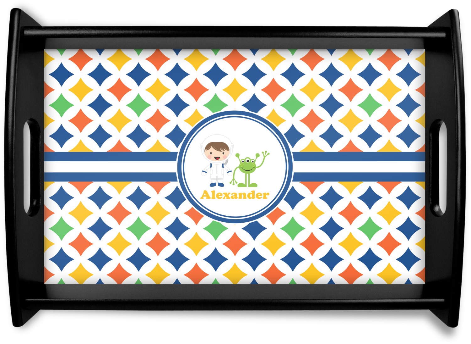 A white wide band trimmed in coordinating blue breaks up the pattern and showcases your little space guy with his martian buddy. Add personalization of your choice for that special touch.