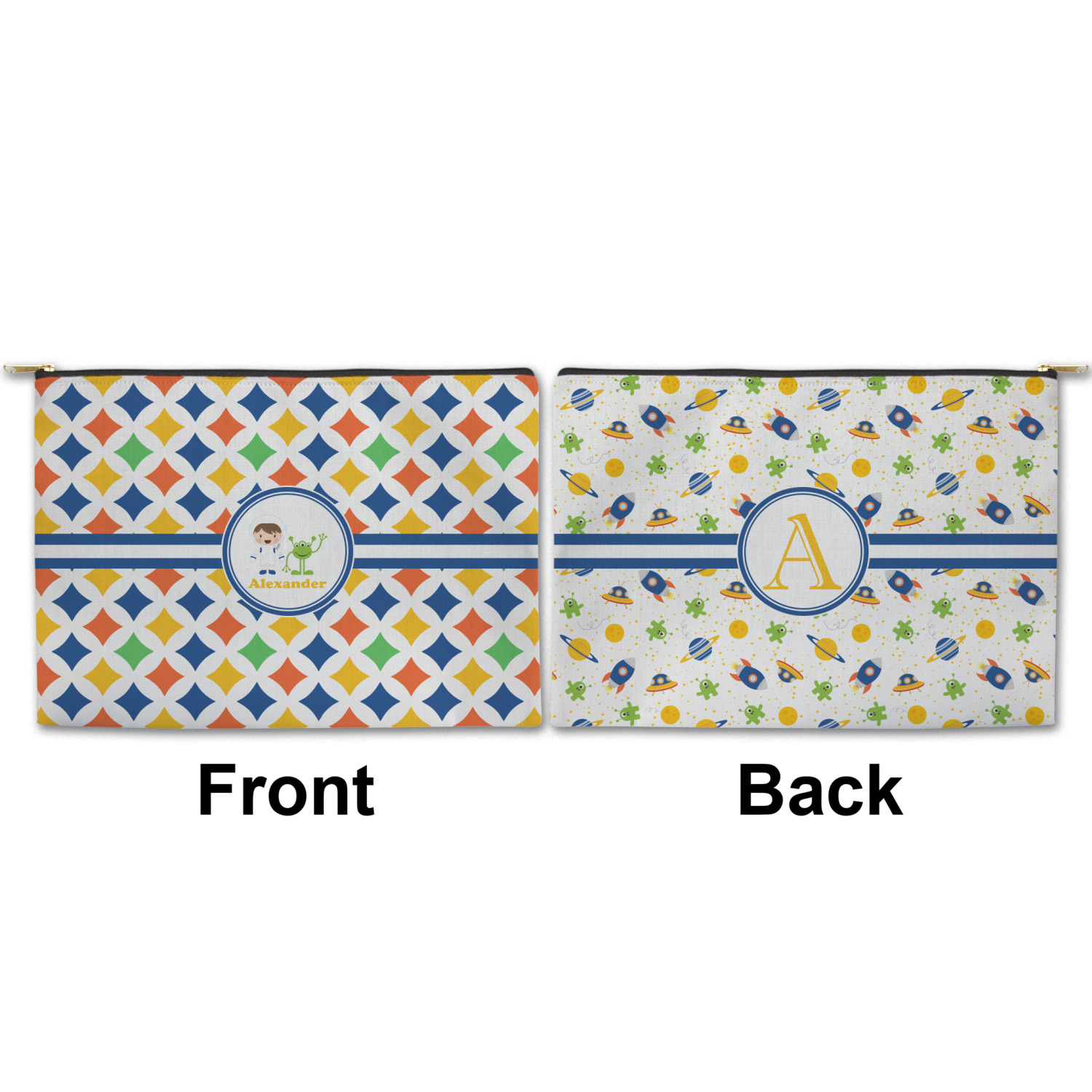 You can design both the front and the back of the pouch - same design, two complementary designs or two totally different designs - the choice is yours! We offer many different personalization styles i.e. name, name & initial, monograms - so the choice to personalize is also yours.