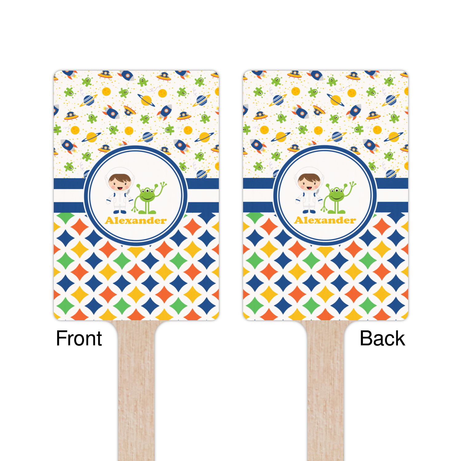 A blue and white band is placed in the middle of the design and used to showcase your little space traveler and his martian buddy. Add your own personalization for that special touch.