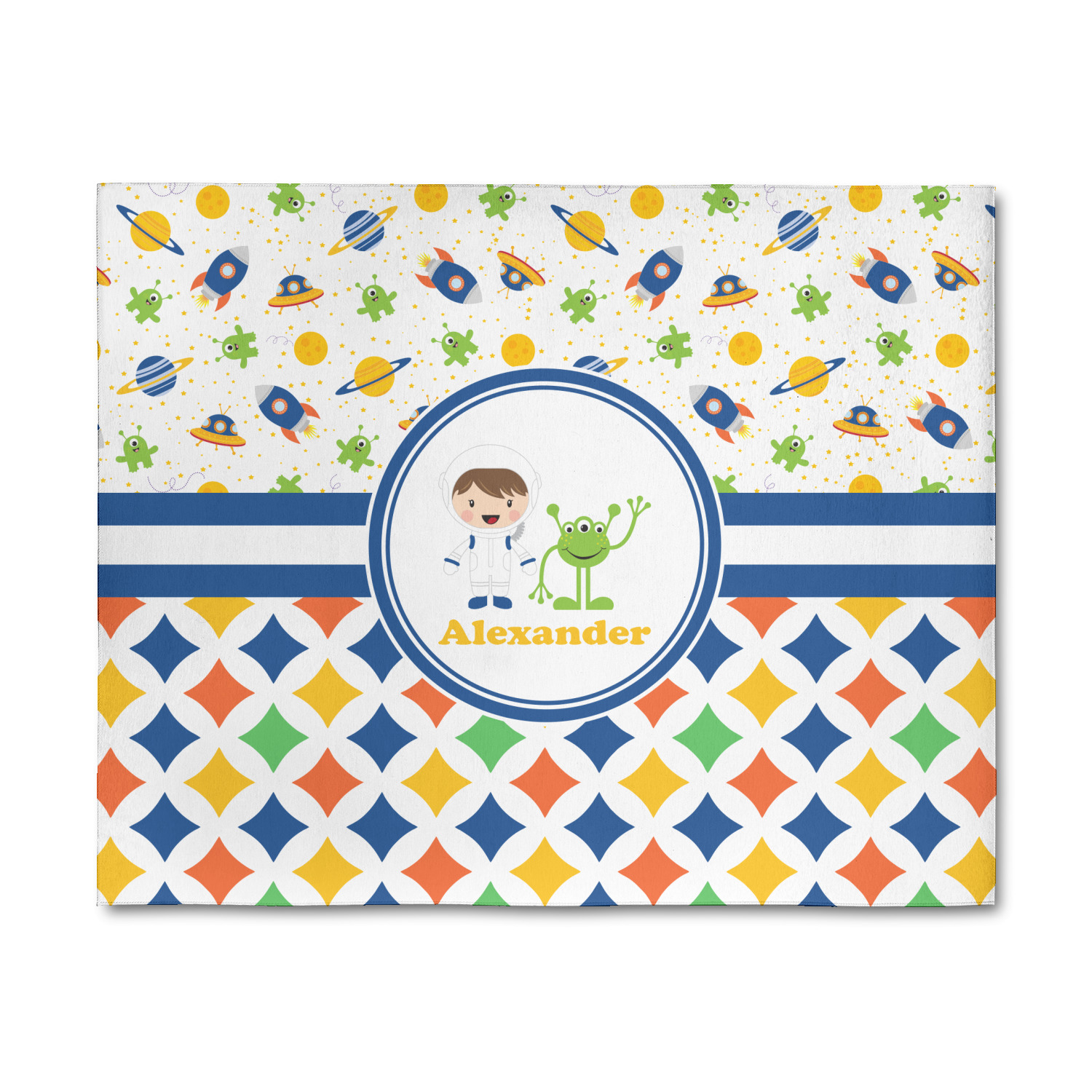 Explore another galaxy with this whimsical space design. Fun colors of blue, orange, yellow, and green make this space exploration come alive. The design is full of little green martians, blue and orange rockets, blue, yellow, and orange spaceships, yellow and blue planets, and yellow stars galore. A retro-future diamond pattern using coordinating colors makes this design outta this world!