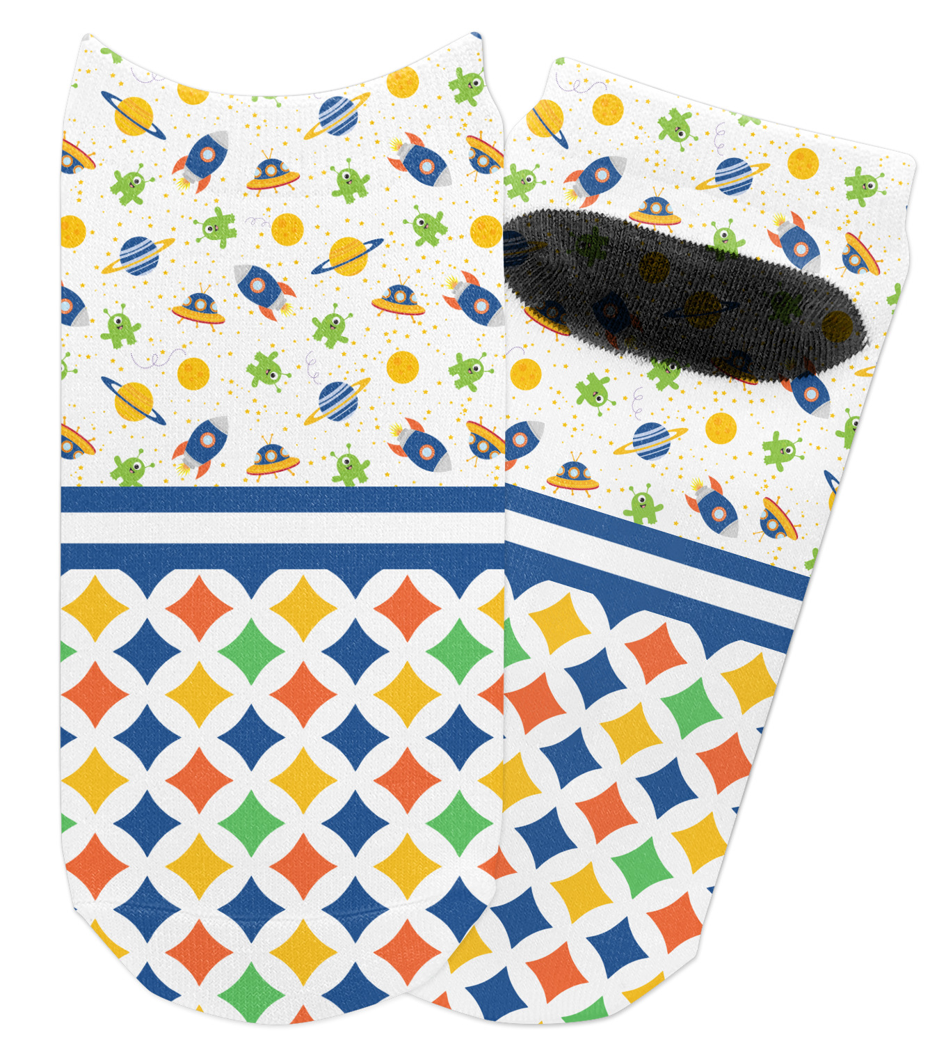 Explore another galaxy with this whimsical space design. Fun colors of blue, orange, yellow, and green make this space exploration come alive. The design is full of little green martians, blue and orange rockets, blue, yellow, and orange spaceships, yellow and blue planets, and yellow stars galore. A retro-future diamond pattern using coordinating colors makes this design outta this world!