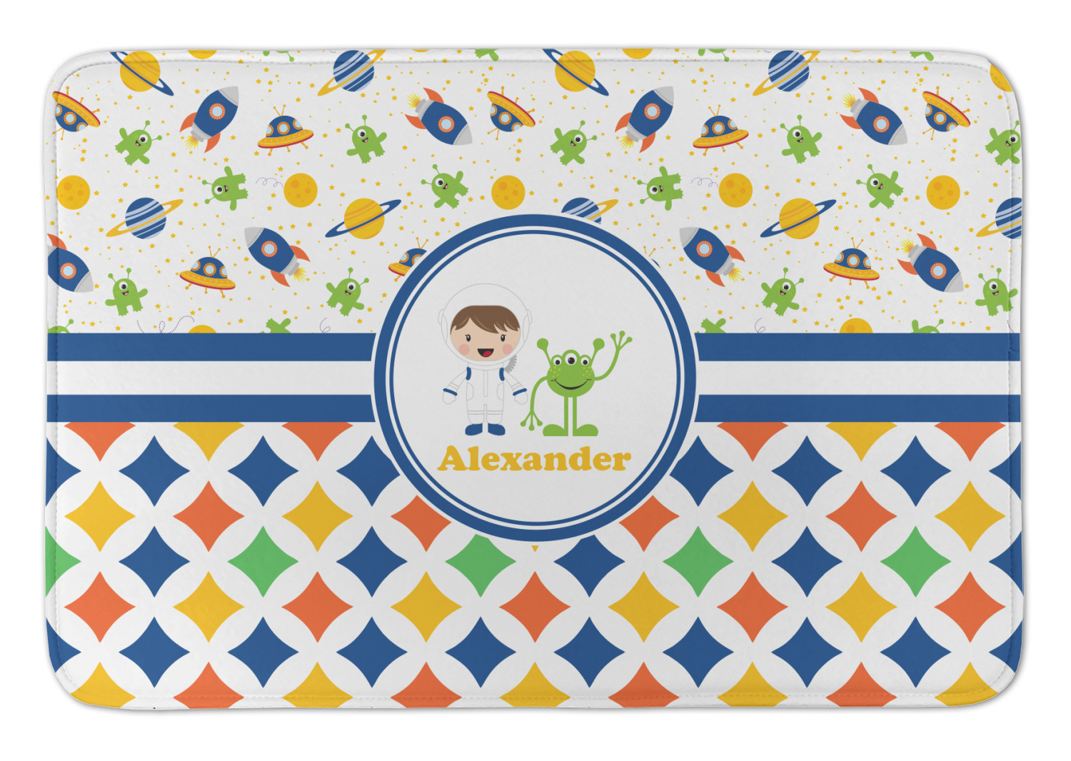 Explore another galaxy with this whimsical space design. Fun colors of blue, orange, yellow, and green make this space exploration come alive. The design is full of little green martians, blue and orange rockets, blue, yellow, and orange spaceships, yellow and blue planets, and yellow stars galore. A retro-future diamond pattern using coordinating colors makes this design outta this world!