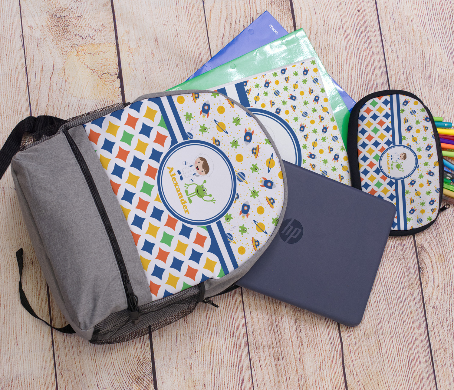 A blue and white band is placed in the middle of the design and used to showcase your little space traveler and his martian buddy. Add your own personalization for that special touch.