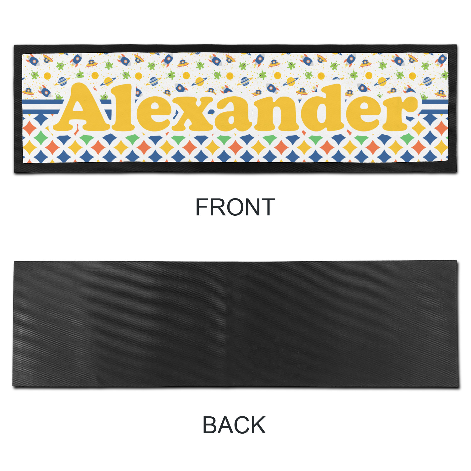 A blue and white band is placed in the middle of the design and used to showcase your little space traveler and his martian buddy. Add your own personalization for that special touch.