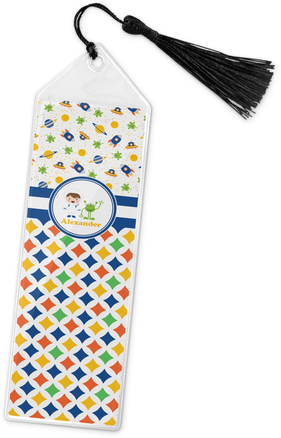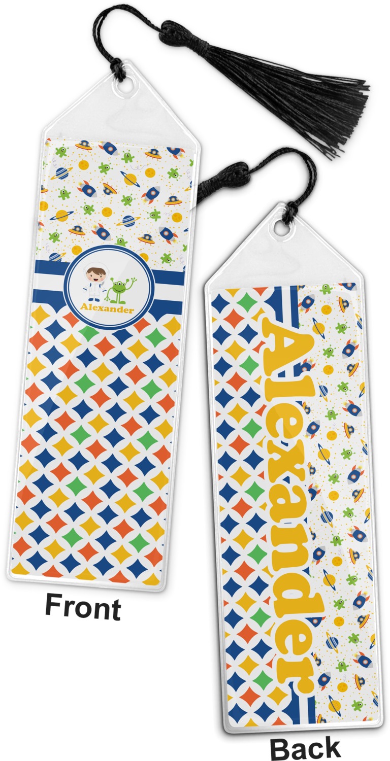 Your personalized bookmark is made of a sturdy, clear vinyl, and is approximately 7.5" x 2.25". We display your personalization on vinyl inserts that are placed on both sides. Accompanying each book marker is a black, fringe tassel that attaches to the reinforced, triangular header.