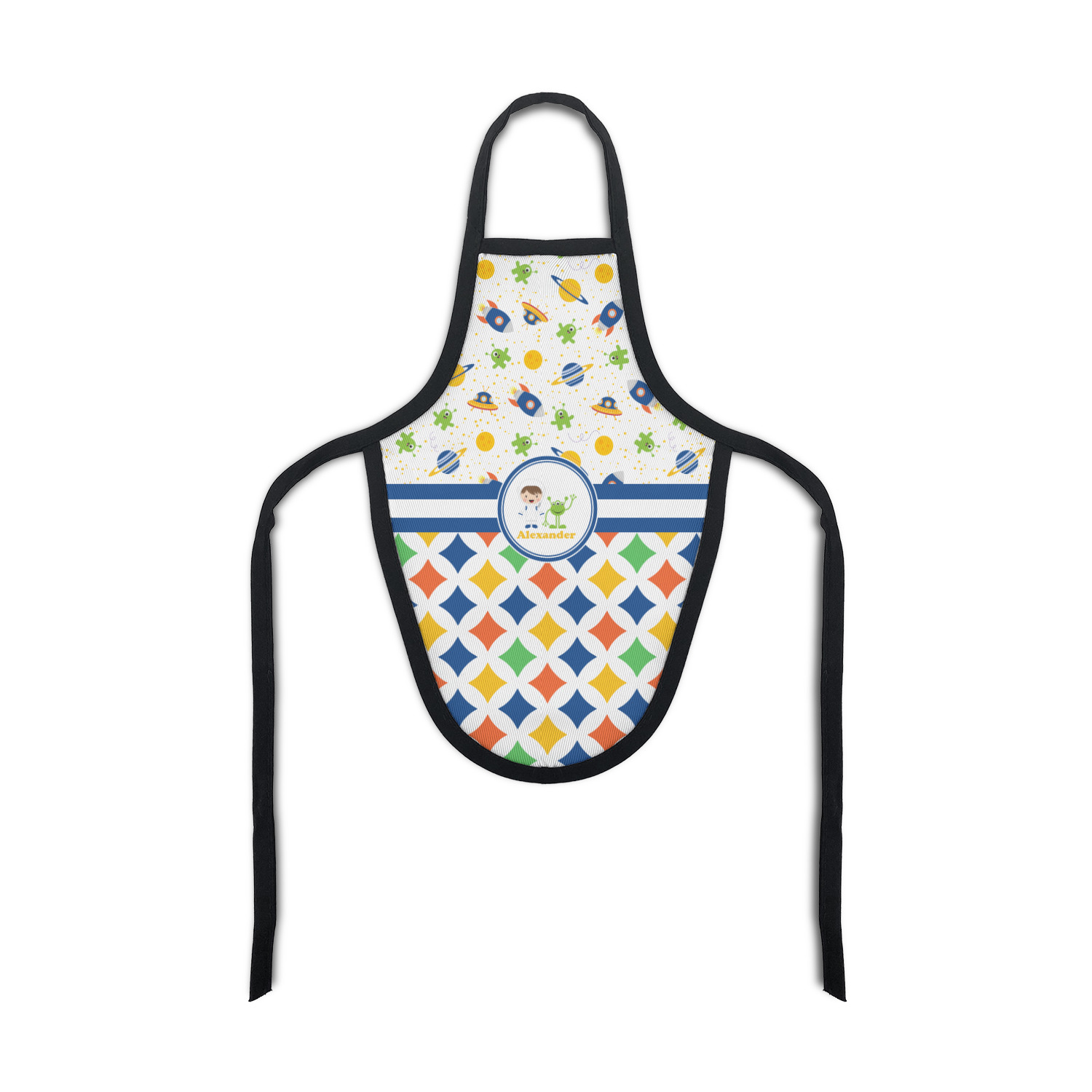 A blue and white band is placed in the middle of the design and used to showcase your little space traveler and his martian buddy. Add your own personalization for that special touch.