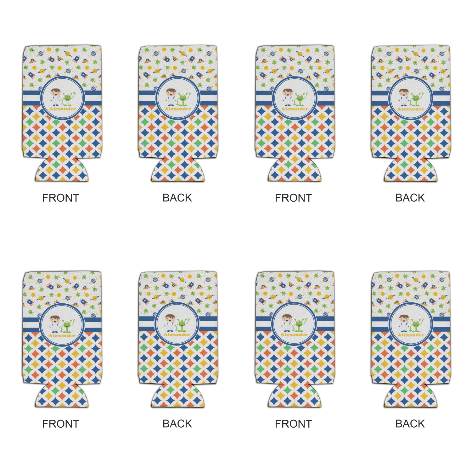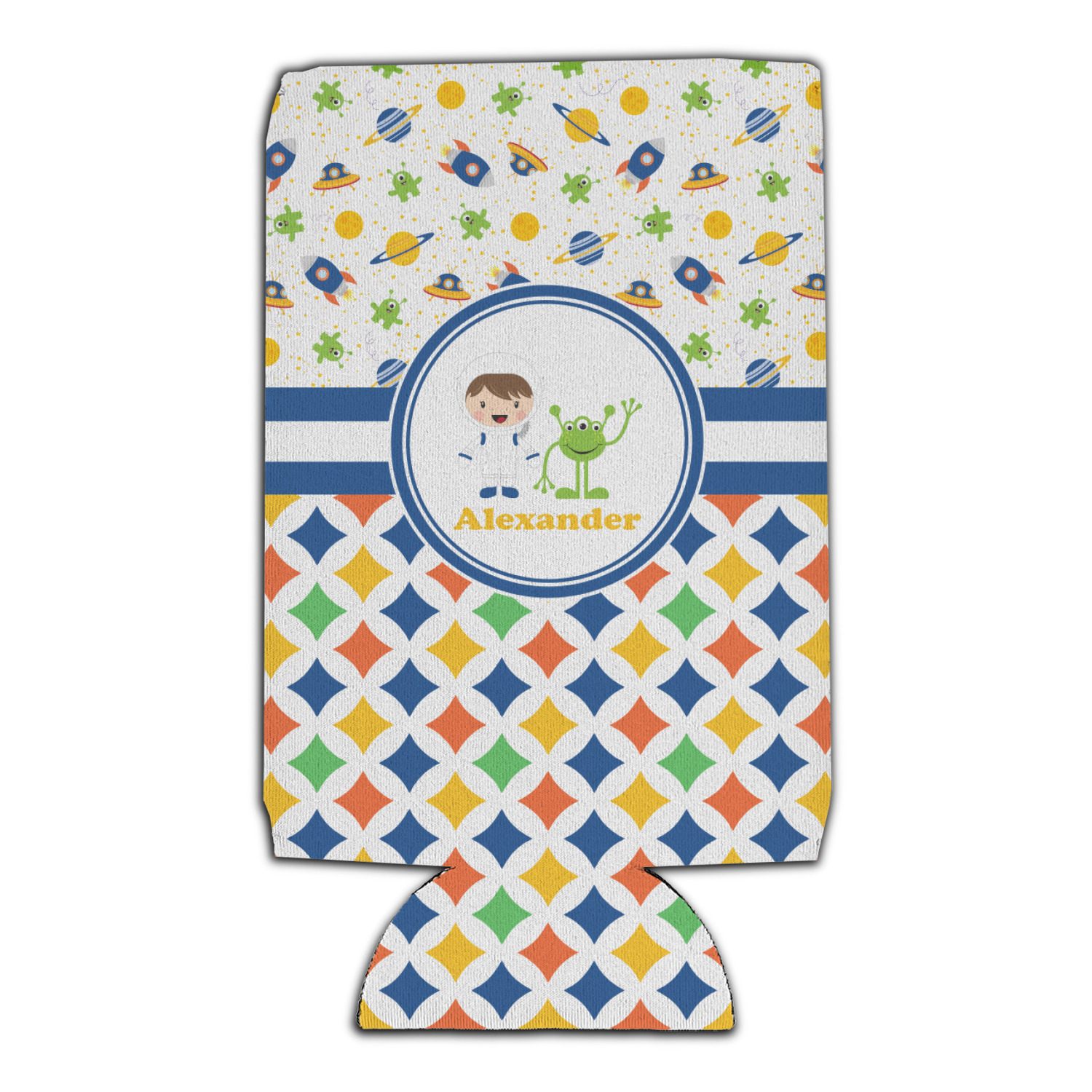 A blue and white band is placed in the middle of the design and used to showcase your little space traveler and his martian buddy. Add your own personalization for that special touch.