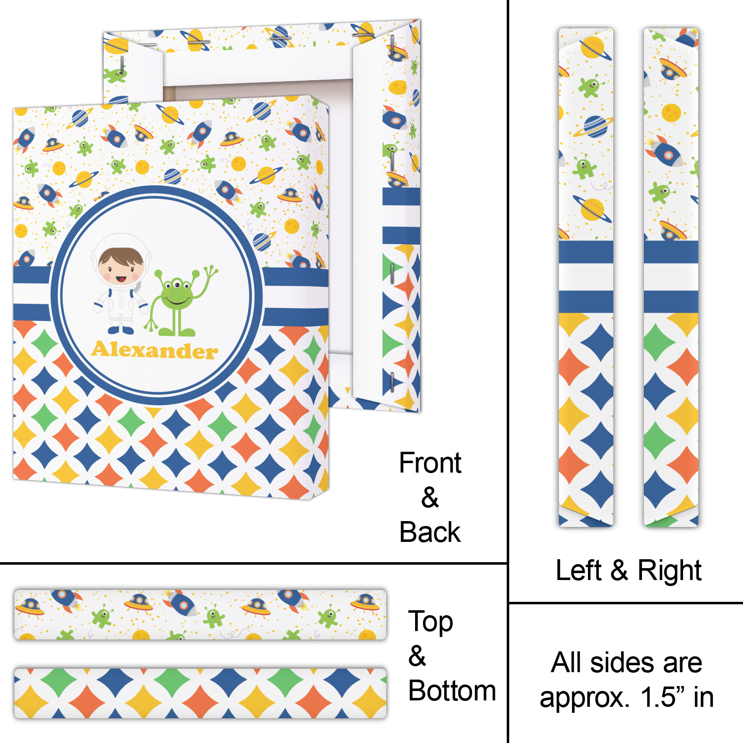 A blue and white band is placed in the middle of the design and used to showcase your little space traveler and his martian buddy. Add your own personalization for that special touch.