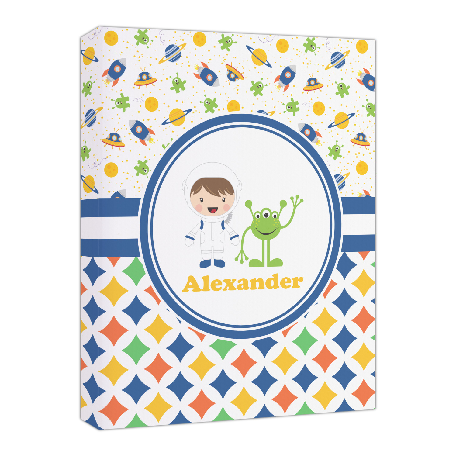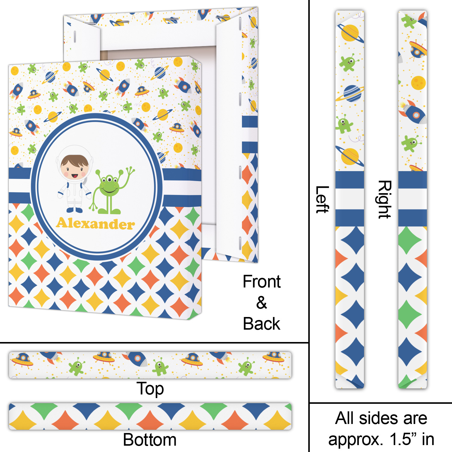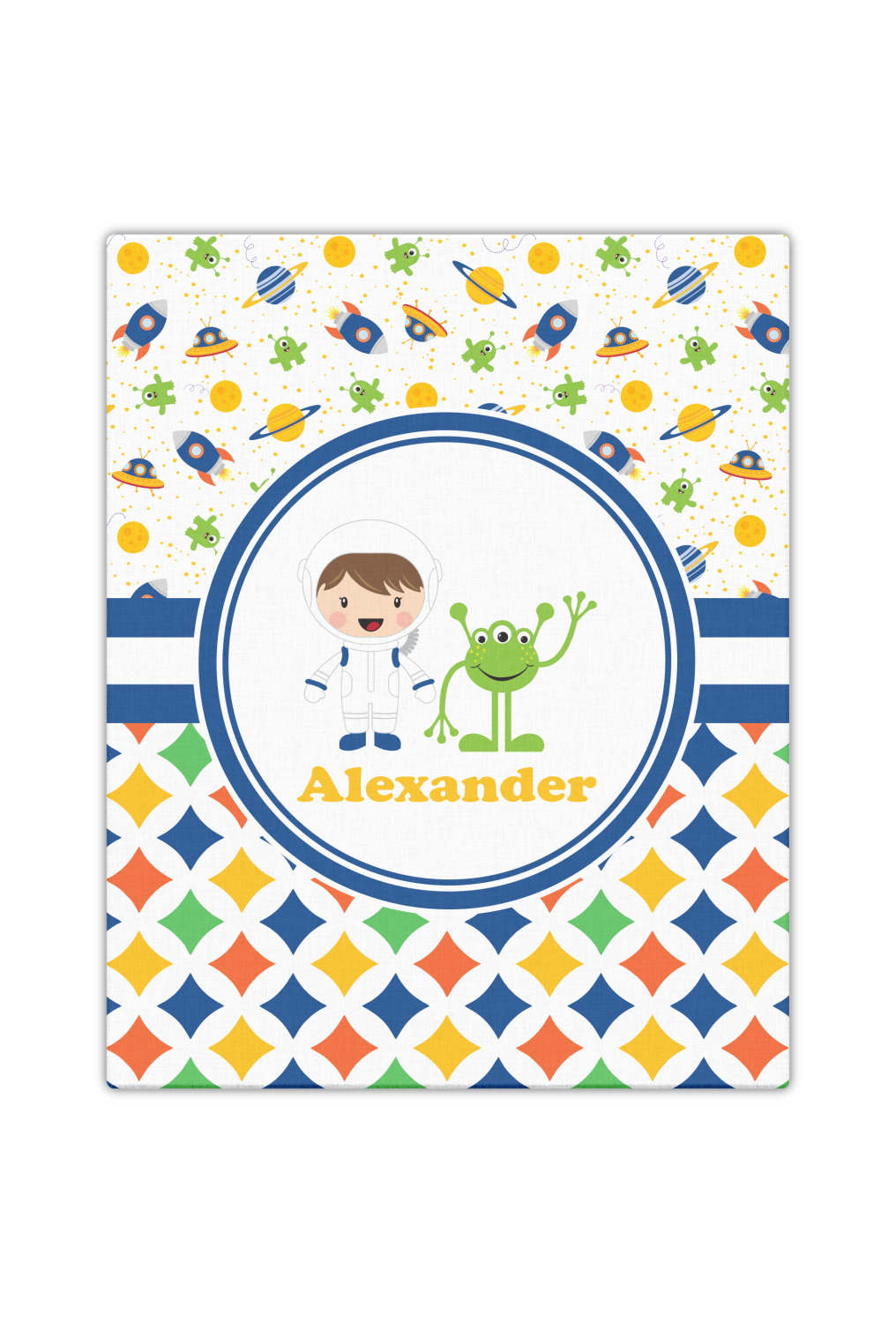 A blue and white band is placed in the middle of the design and used to showcase your little space traveler and his martian buddy. Add your own personalization for that special touch.
