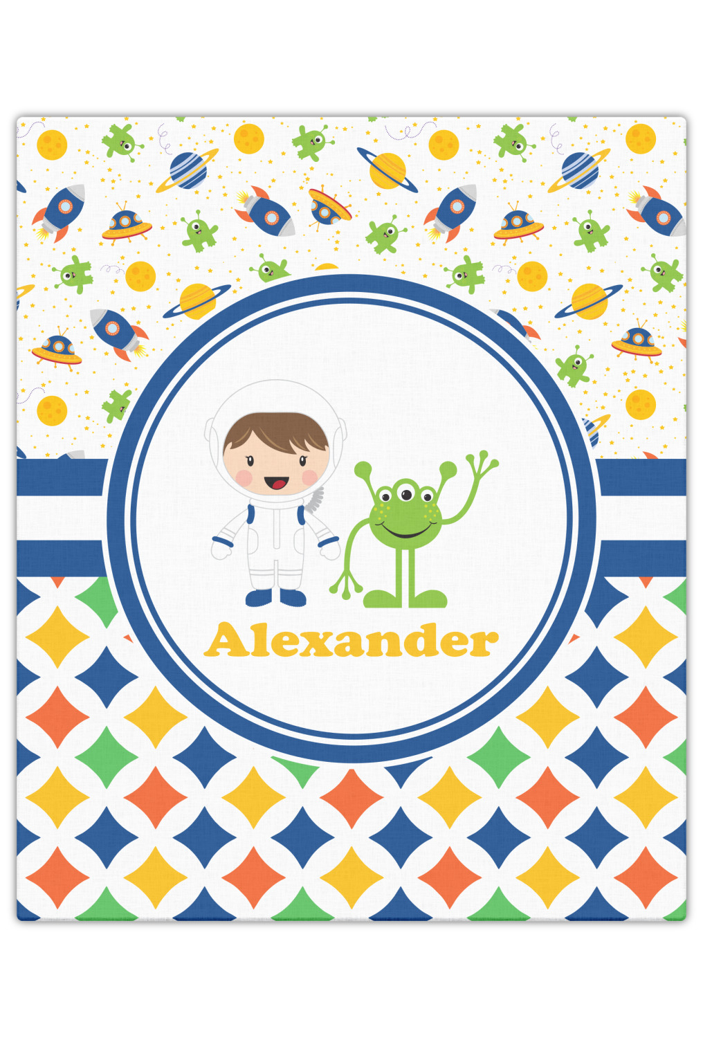 A blue and white band is placed in the middle of the design and used to showcase your little space traveler and his martian buddy. Add your own personalization for that special touch.