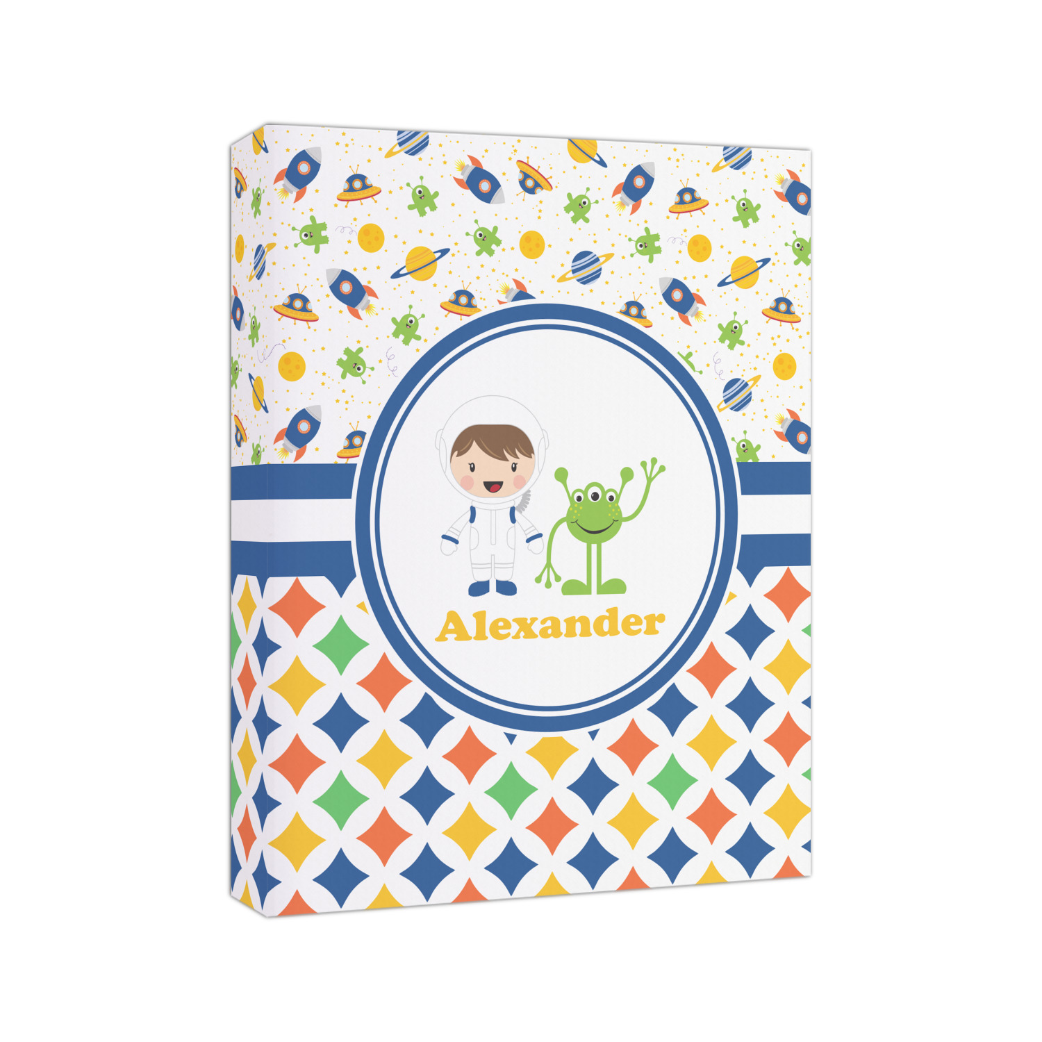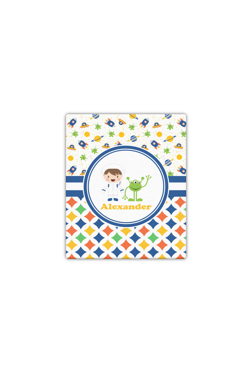 A blue and white band is placed in the middle of the design and used to showcase your little space traveler and his martian buddy. Add your own personalization for that special touch.
