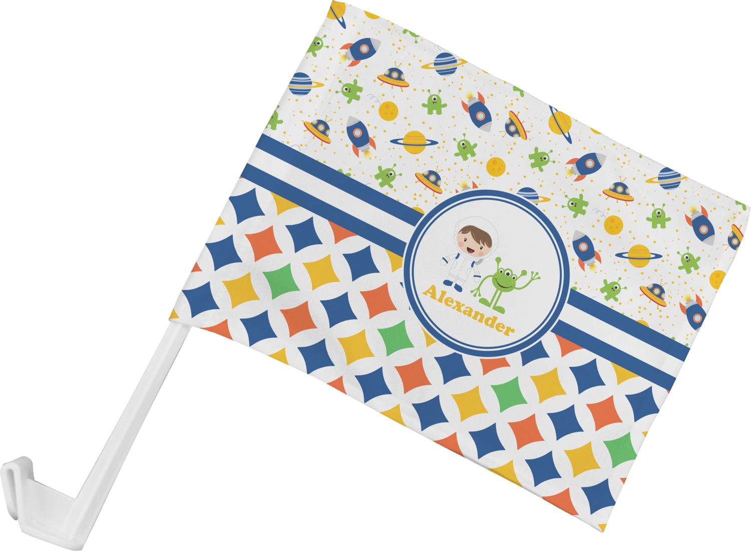 A blue and white band is placed in the middle of the design and used to showcase your little space traveler and his martian buddy. Add your own personalization for that special touch.