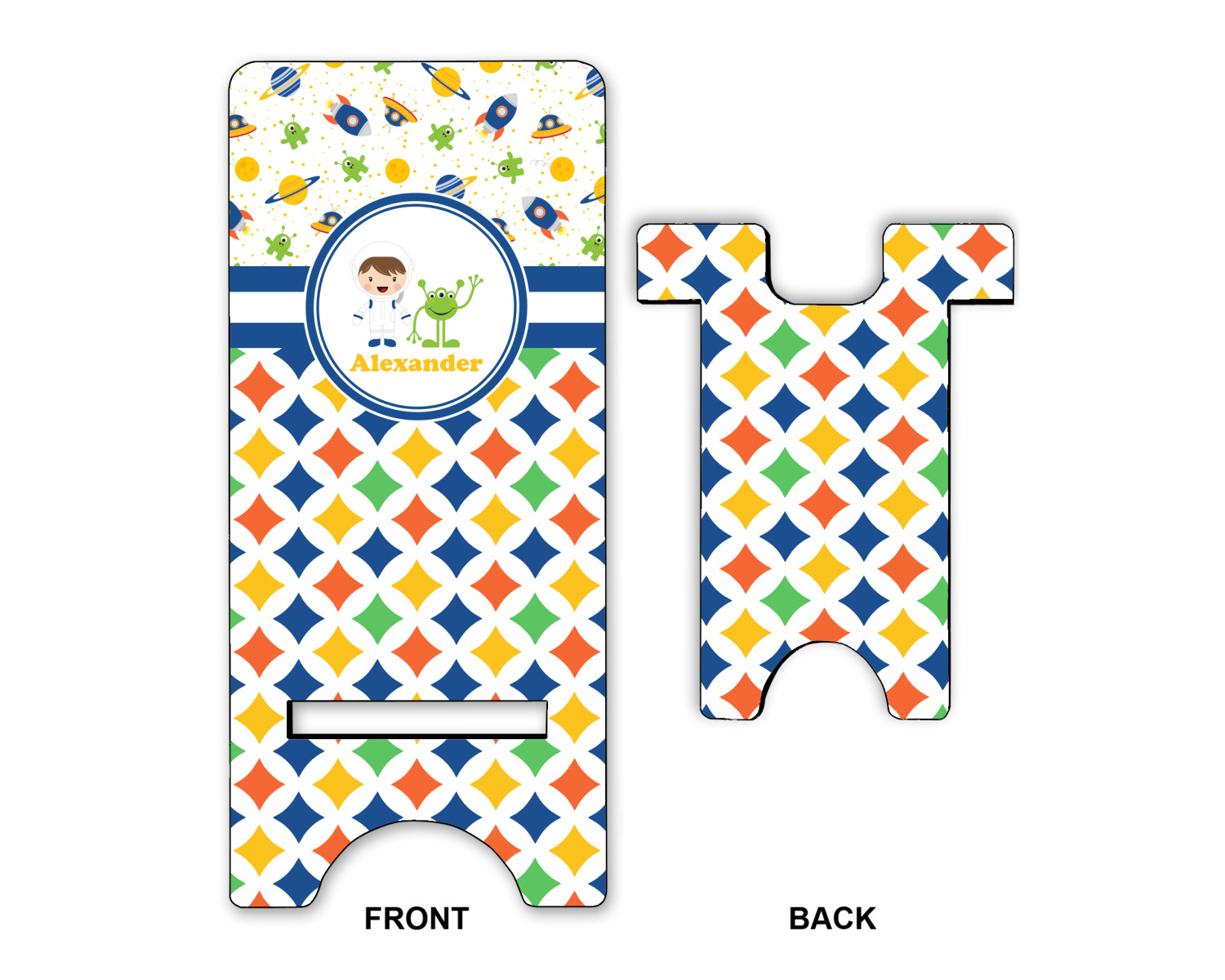 A blue and white band is placed in the middle of the design and used to showcase your little space traveler and his martian buddy. Add your own personalization for that special touch.