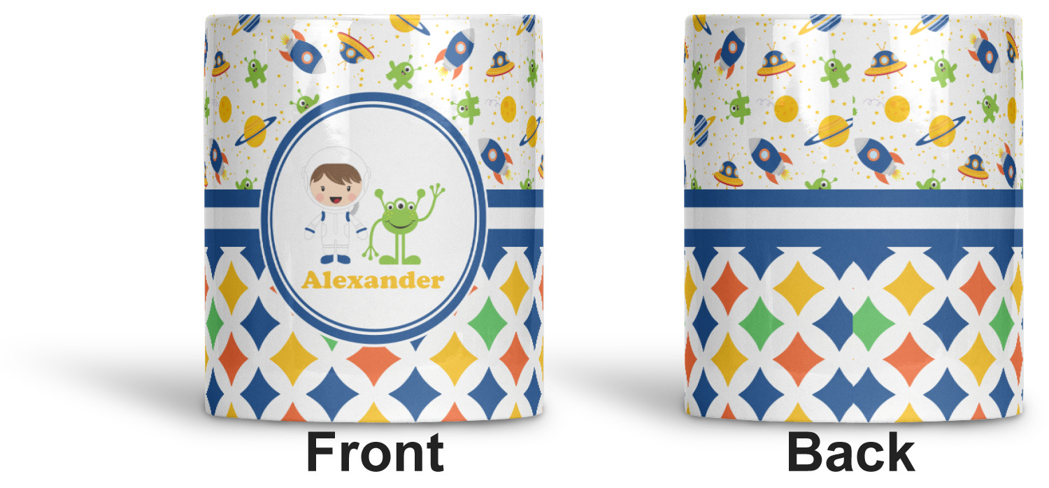 A blue and white band is placed in the middle of the design and used to showcase your little space traveler and his martian buddy. Add your own personalization for that special touch.