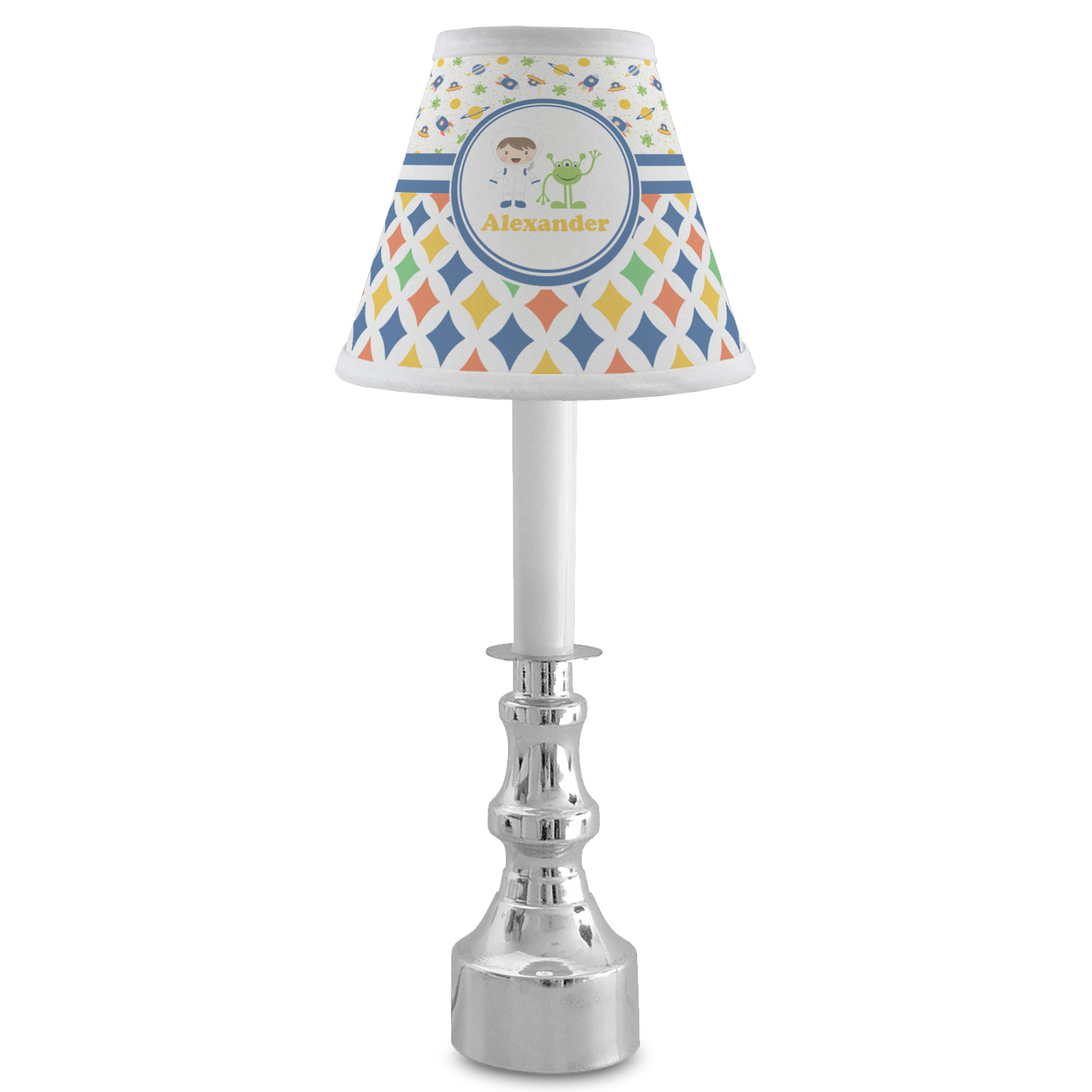A blue and white band is placed in the middle of the design and used to showcase your little space traveler and his martian buddy. Add your own personalization for that special touch.